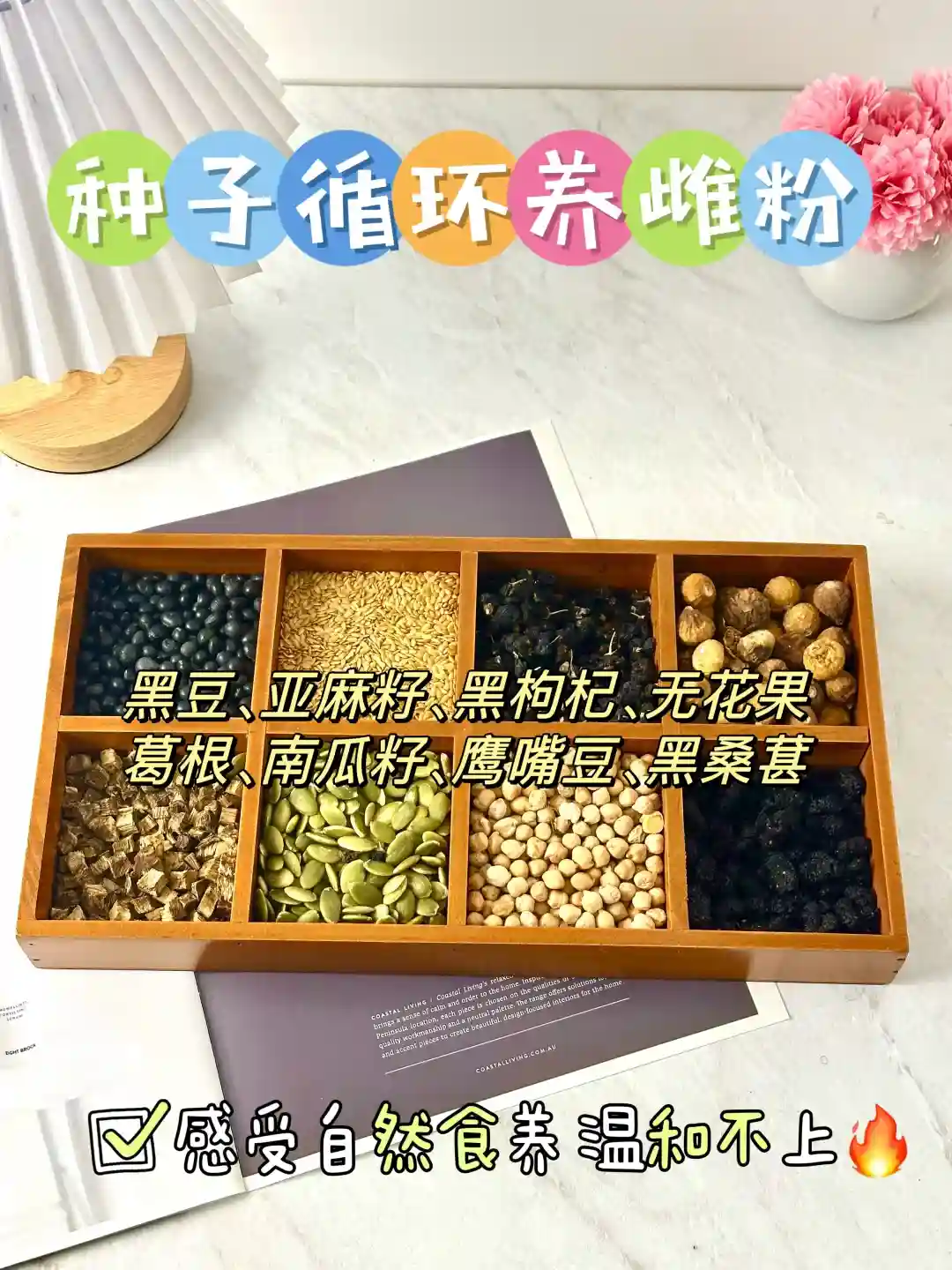 其原料选用了亚麻籽、无花果、南瓜籽、黑枸杞、黑桑葚、鹰嘴豆、黑豆、葛根等天然种子食材,对于女生的子宮和卯巢好处众多。