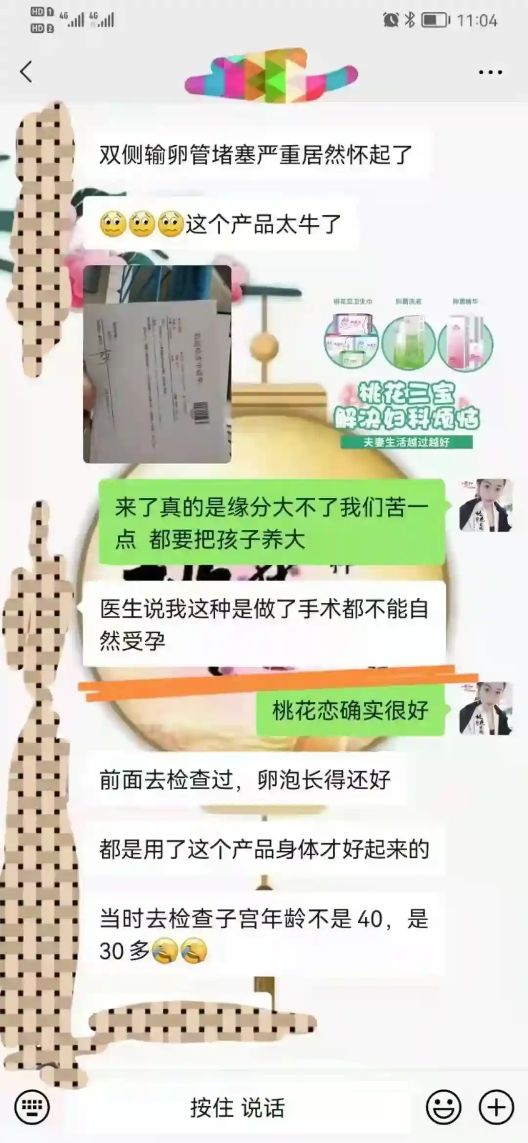 在听说桃花🌸 三宝功效的时候 特别想试一试 但是由于经济条件有限 每次买的产品都舍不得用 给她规定的每天6—8片 结果她都是用三片 泡泡一个星期用三次 一直想要生二胎 检查结果输卵管堵塞 没办法受孕了 要不就是做试管