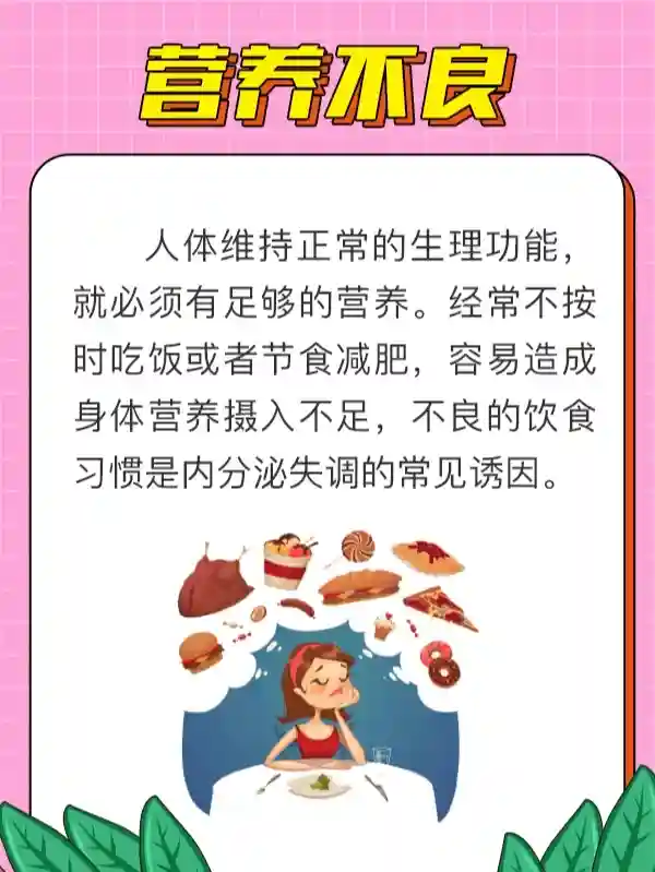 人体维持正常的生理功能,就必须有足够的营养。经常不按时吃饭或者节食减肥,容易造成身体营养摄入不足,不良的饮食习惯是内分泌失调的常见诱因。