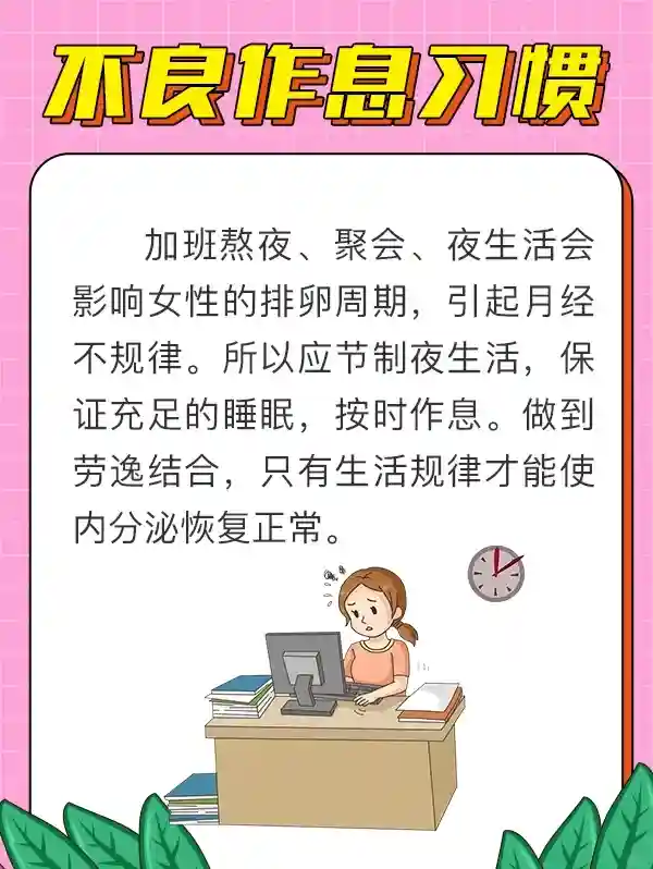 加班熬夜、聚会、夜生活会影响女性的排卵周期,引起月经不规律。所以应节制夜生活,保证充足的睡眠,按时作息做到劳逸结合,只有生活规律才能使内分泌恢复正常。