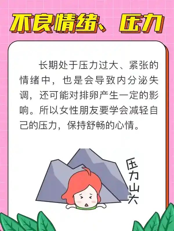 长期处于压力过大、紧张的情绪中,也是会导致内分泌失调,还可能对排卵产生一定的影响。所以女性朋友要学会减轻自己的压力,保持舒畅的心情。