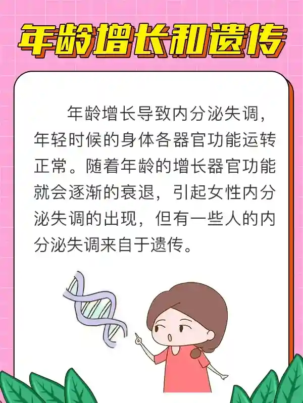 年龄增长导致内分泌失调,年轻时候的身体各器官功能运转正常。随着年龄的增长器官功能就会逐渐的衰退,引起女性内分泌失调的出现,但有一些人的内分泌失调来自于遗传。