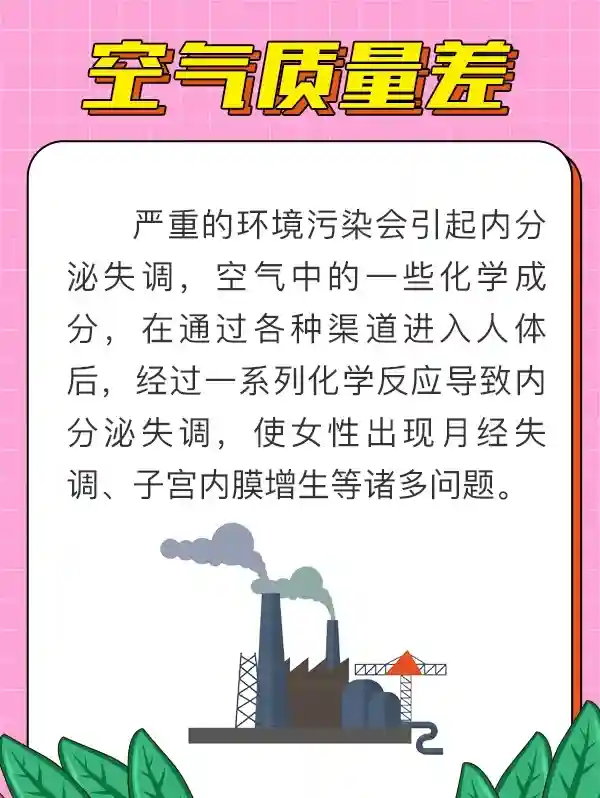 严重的环境污染会引起内分泌失调,空气中的一些化学成分,在通过各种渠道进入人体后,经过一系列化学反应导致内分泌失调,使女性出现月经失调、子宫内膜增生等诸多问题。
