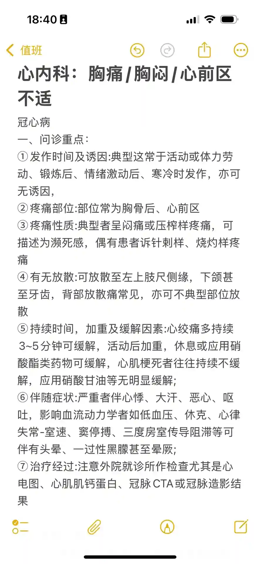 ④有无放散:可放散至左上肢尺侧缘,下颌甚至牙齿,背部放散痛常见,亦可不典型部位放散