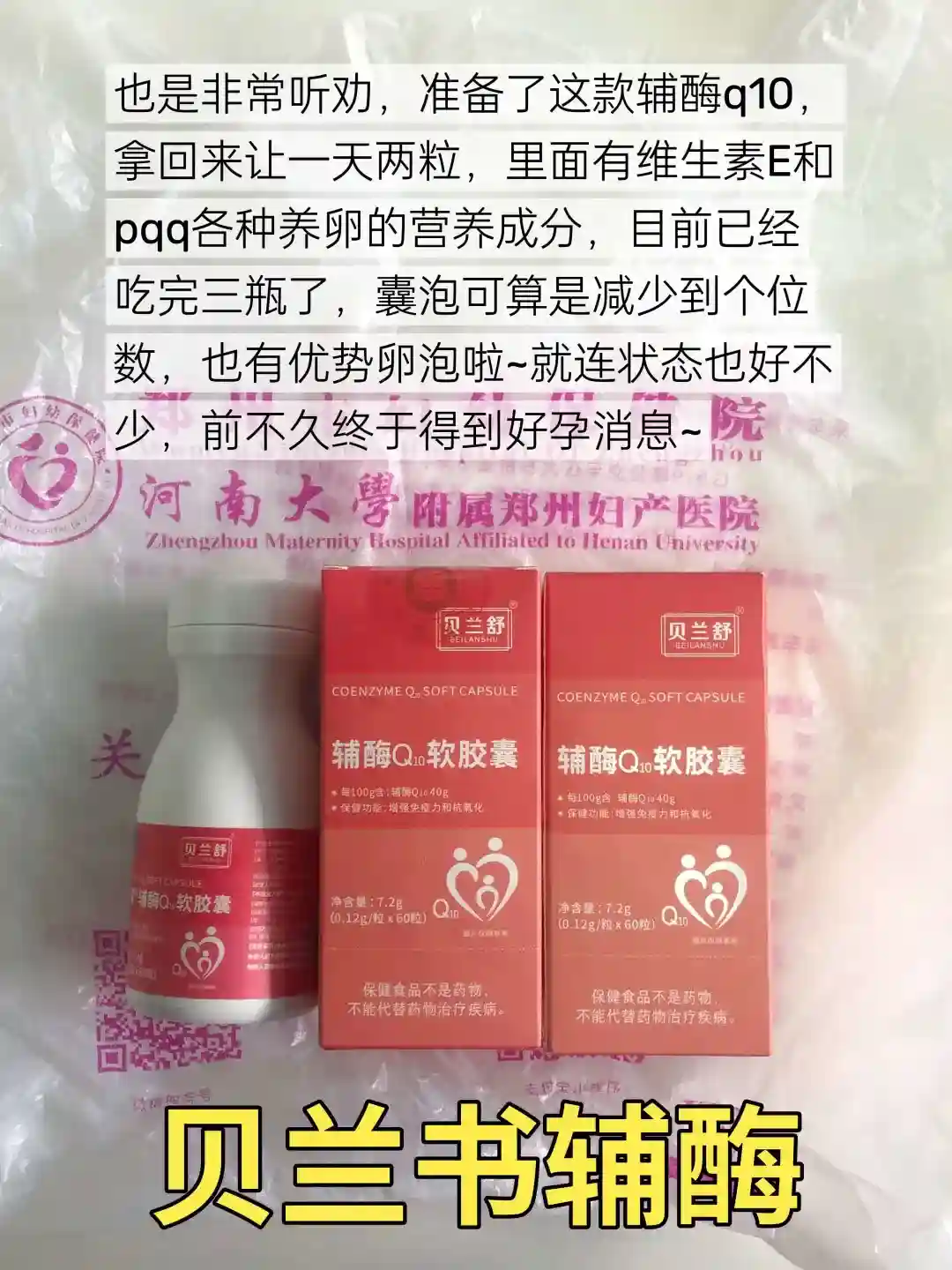 辅酶q10:也是非常听劝,准备了这款辅酶q10,拿回来让一天两粒,里面有维生素E和pqq各种养卵的营养成分,目前已经吃完三瓶了,囊泡可算是减少到个位数,也有优势卵泡啦~就连状态也好不少,前不久终于得到好孕消息~