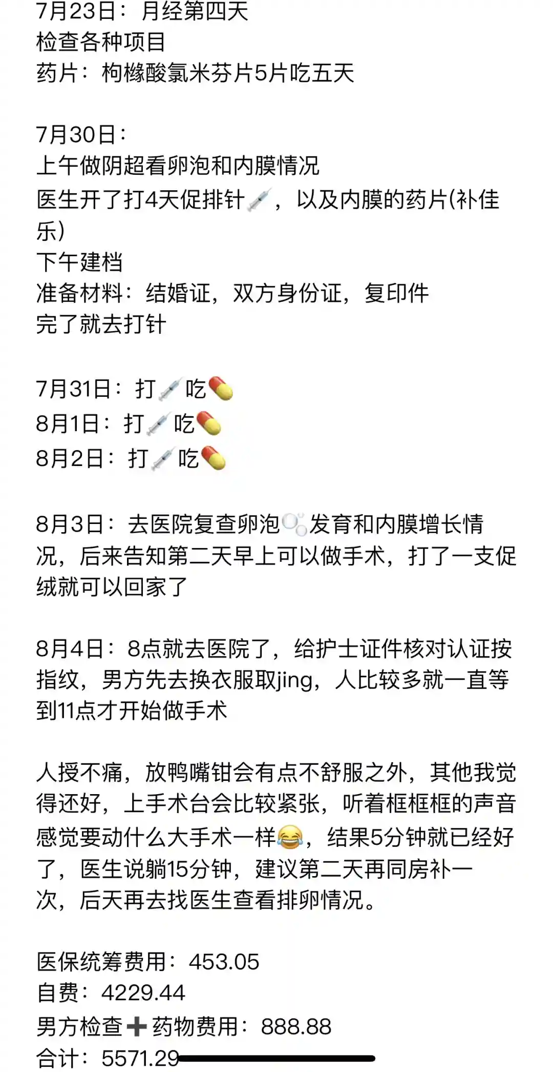 人授不痛,放鸭嘴钳会有点不舒服之外,其他我觉得还好,上手术台会比较紧张,听着框框框的声音感觉要动什么大手术一样😂,结果5分钟就已经好了,医生说躺15分钟,建议第二天再同房补一次,后天再去找医生查看排卵情况。