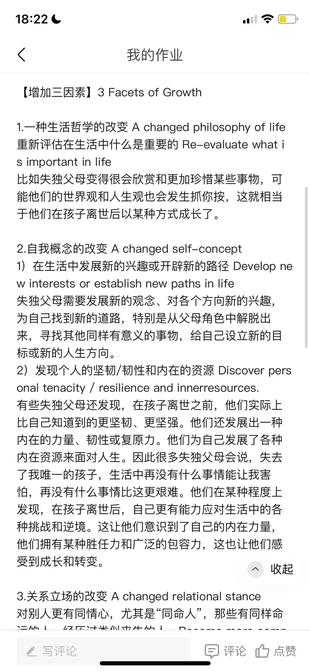 有些失独父母还发现,在孩子离世之前,他们实际上比自己知道到的更坚韧、更坚强。他们还发展出一种内在的力量、韧性或复原力。他们为自己发展了各种内在资源来面对人生。因此很多失独父母会说,失去了我唯一的孩子,生活中再没有什么事情能让我害怕,再没有什么事情比这更艰难。他们在某种程度上发现,在孩子离世后,自己更有能力应对生活中的各种挑战和逆境。这让他们意识到了自己的内在力量,他们拥有某种胜任力和广泛的包容力,这也让他们感受到成长和转变。