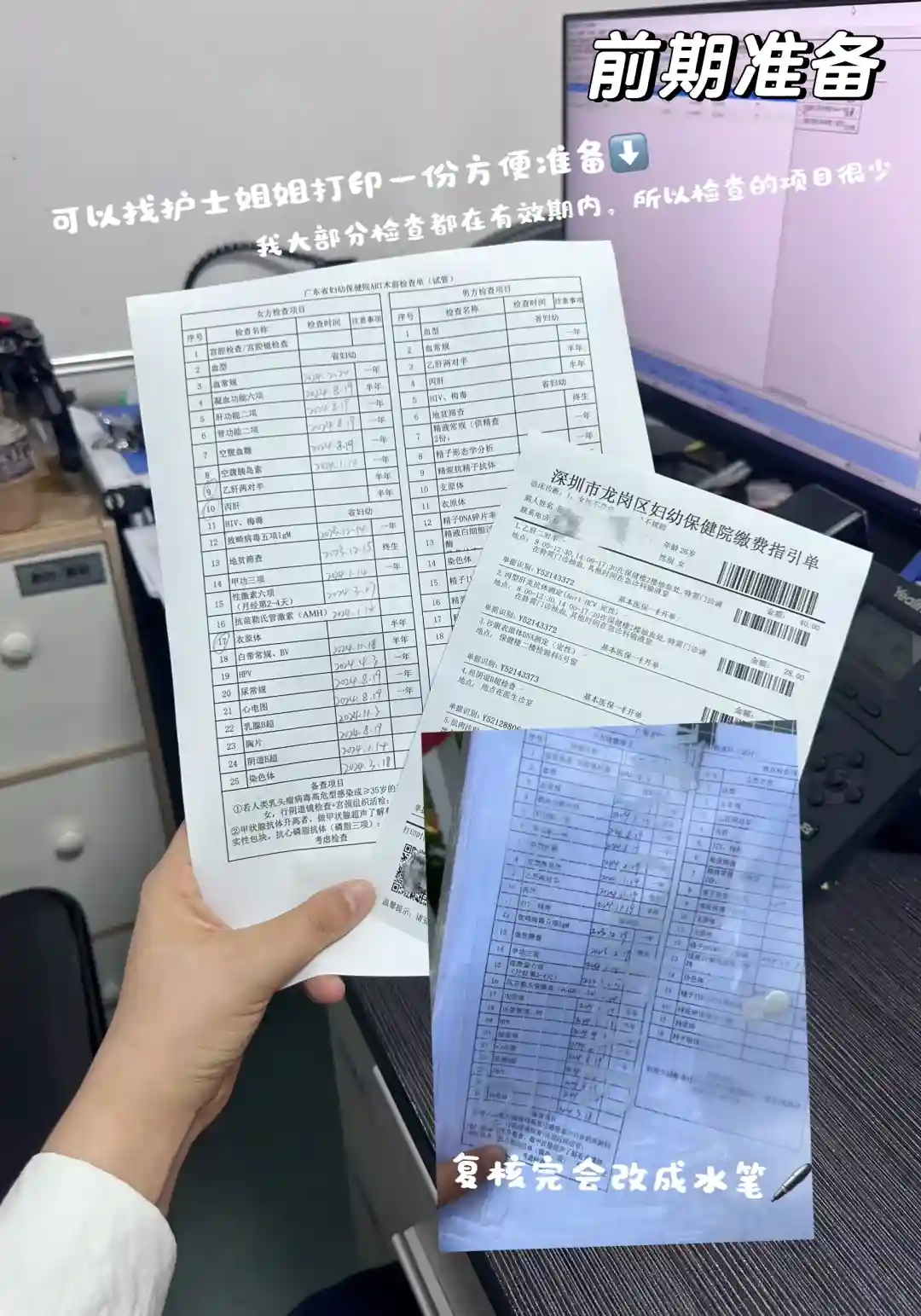分别挂男女科生殖医生的号,去医院前整理好报告(需要纸质版!不分医院,住院和门诊的报告都能用),方便医生核对开单。