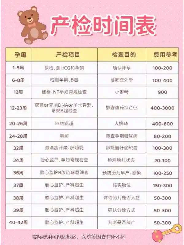 做好费用准备:产检时间表中提供了每个产检项目的大致费用参考,这有助于新手妈妈提前做好经济上的准备,合理安排家庭开支,避免因费用问题而产生不必要的焦虑。
