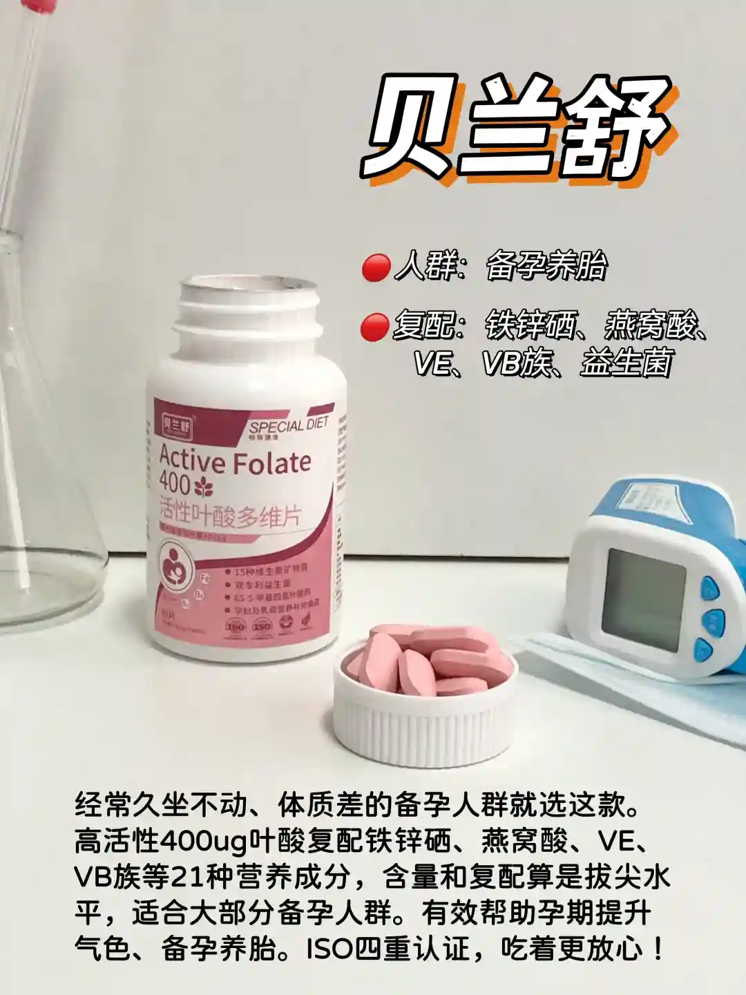 #贝兰舒活性叶酸:400ug叶酸+铁锌硒、燕窝酸、VE、VB族