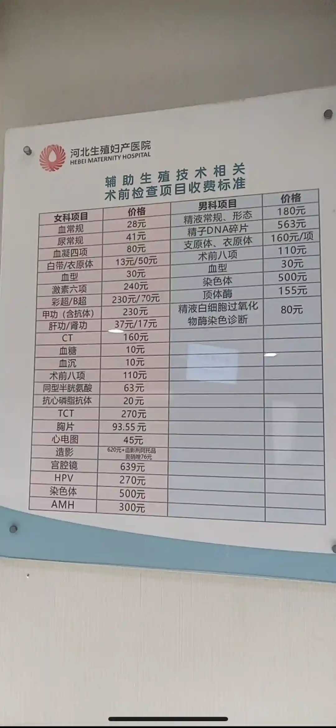 然后我就在公众号问了一下河北生殖妇产医院的,他们那里可以自费做hpv、精子分析这些(图三附河北生殖的收费标准,目前他们那里体检是不免费的);