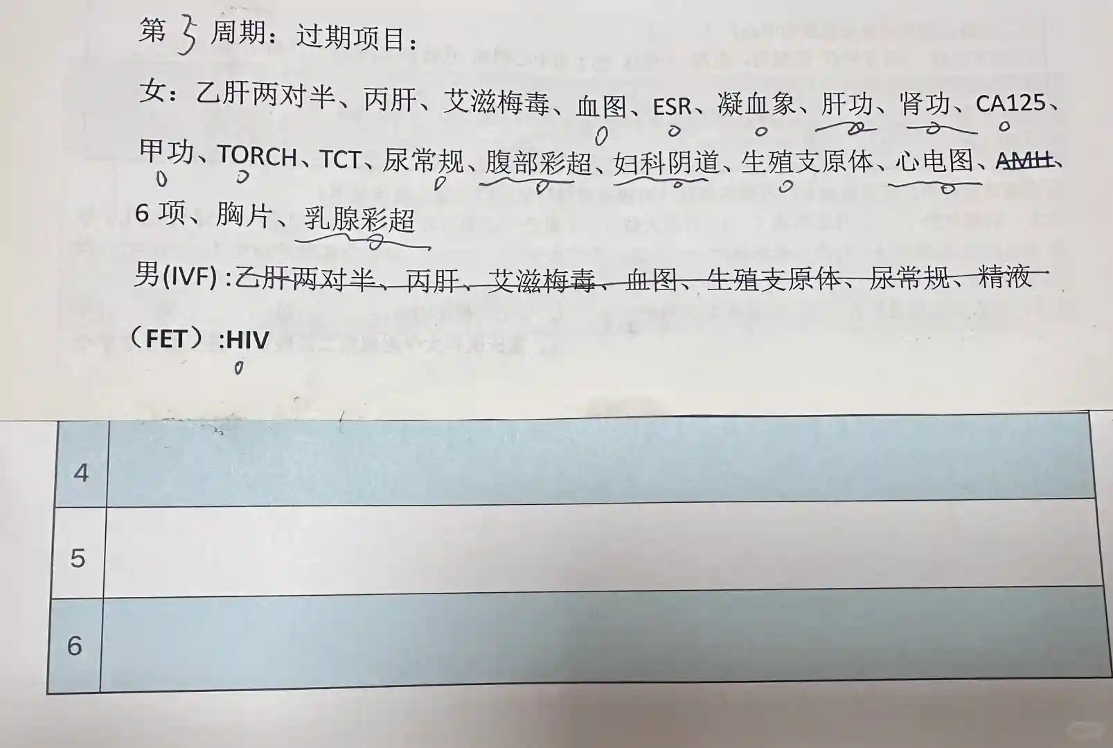 2024.5.1我到医院做了冻胚移植术前检查,圆圈部分是医生给我开的检查,剩下部分医生让我经期第3天去做,医生告知传染病检查有效期3个月,其余检查有效期1年,血型和染色体不用查,其他医院的检查报告他们也认,不用重复检查,男方只需要查艾滋(如图一)。