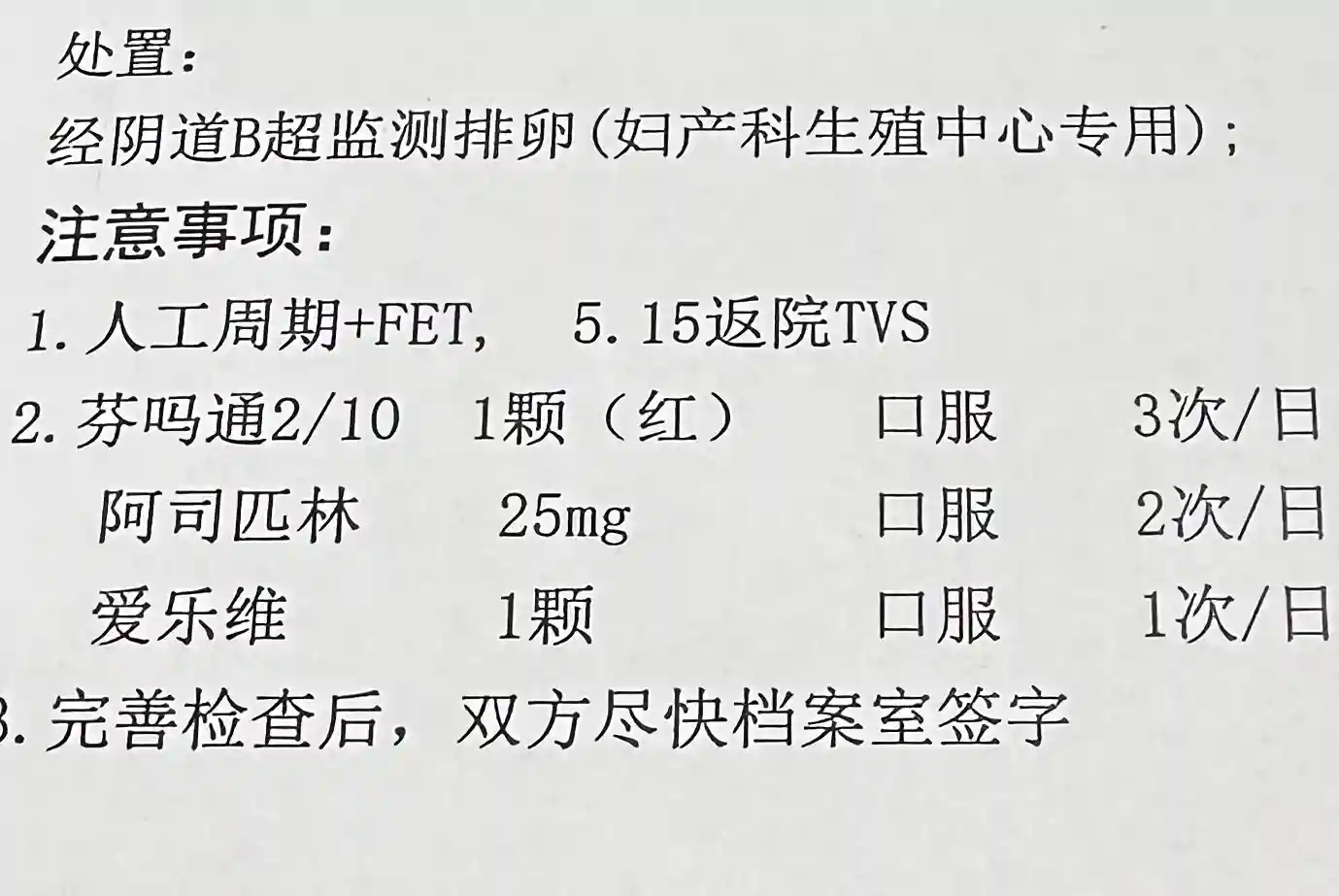 2024.5.8经期第3天,到医院做了剩下的检查,B超写的内膜只有4mm,有点薄,医生说是正常的,这个时期内膜厚才不正常。抽血的报告出来后,医生给我定的人工周期方案,然后开了药,让我5.15回医院(如图二)。