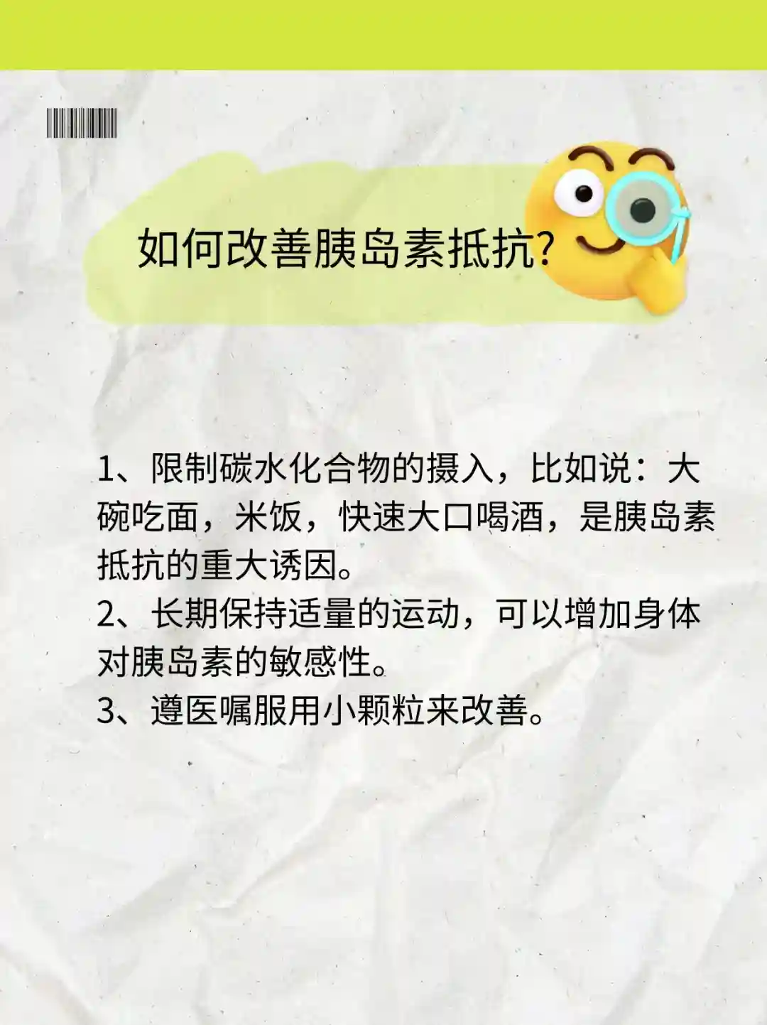 1、限制碳水化合物的摄入,比如说:大碗吃面,米饭,快速大口喝酒,是胰岛素抵抗的重大诱因。