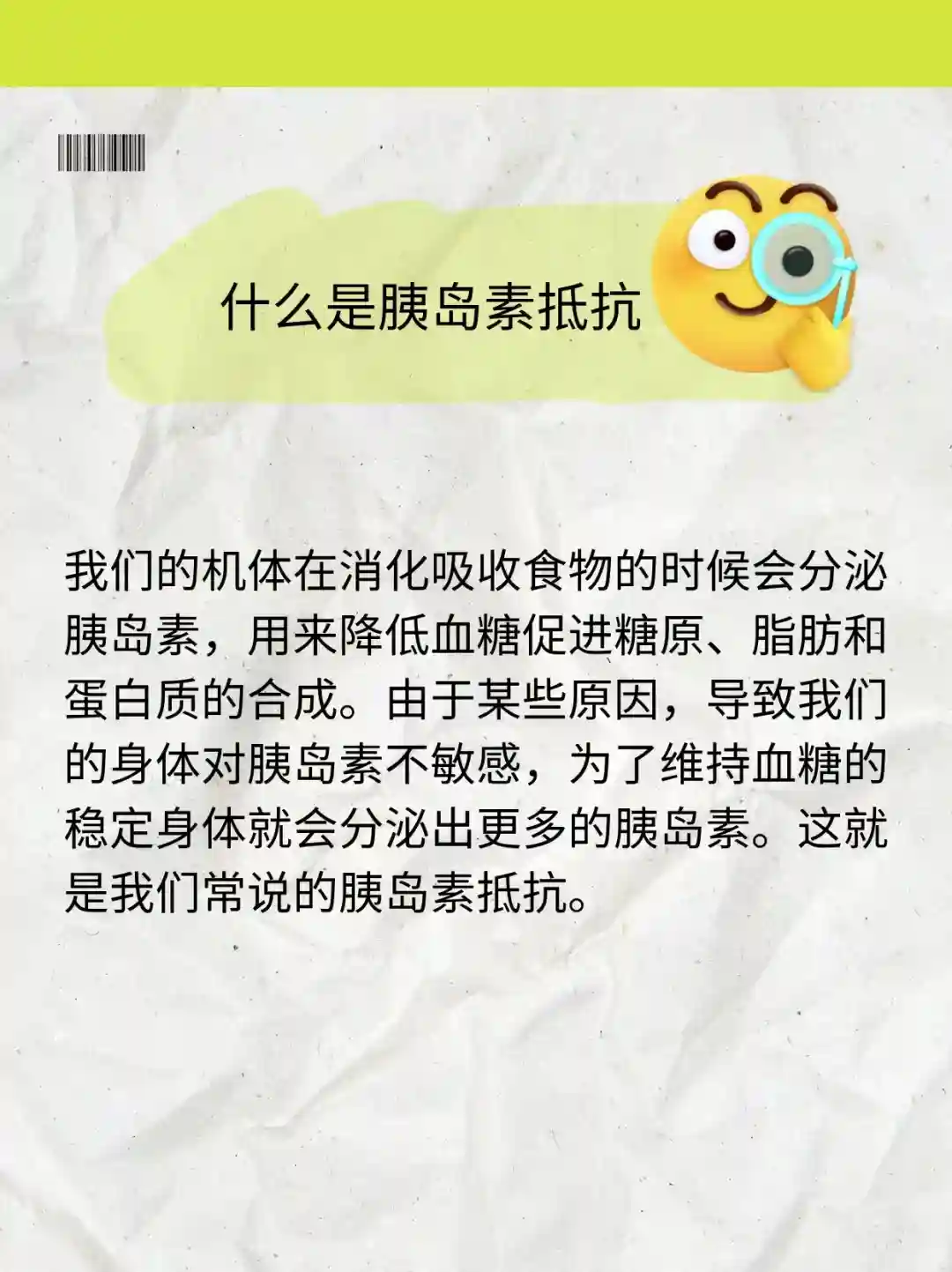 我们的机体在消化吸收食物的时候会分泌胰岛素,用来降低血糖促进糖原、脂肪和蛋白质的合成。由于某些原因,导致我们的身体对胰岛素不敏感,为了维持血糖的稳定身体就会分泌出更多的胰岛素。这就是我们常说的胰岛素抵抗。