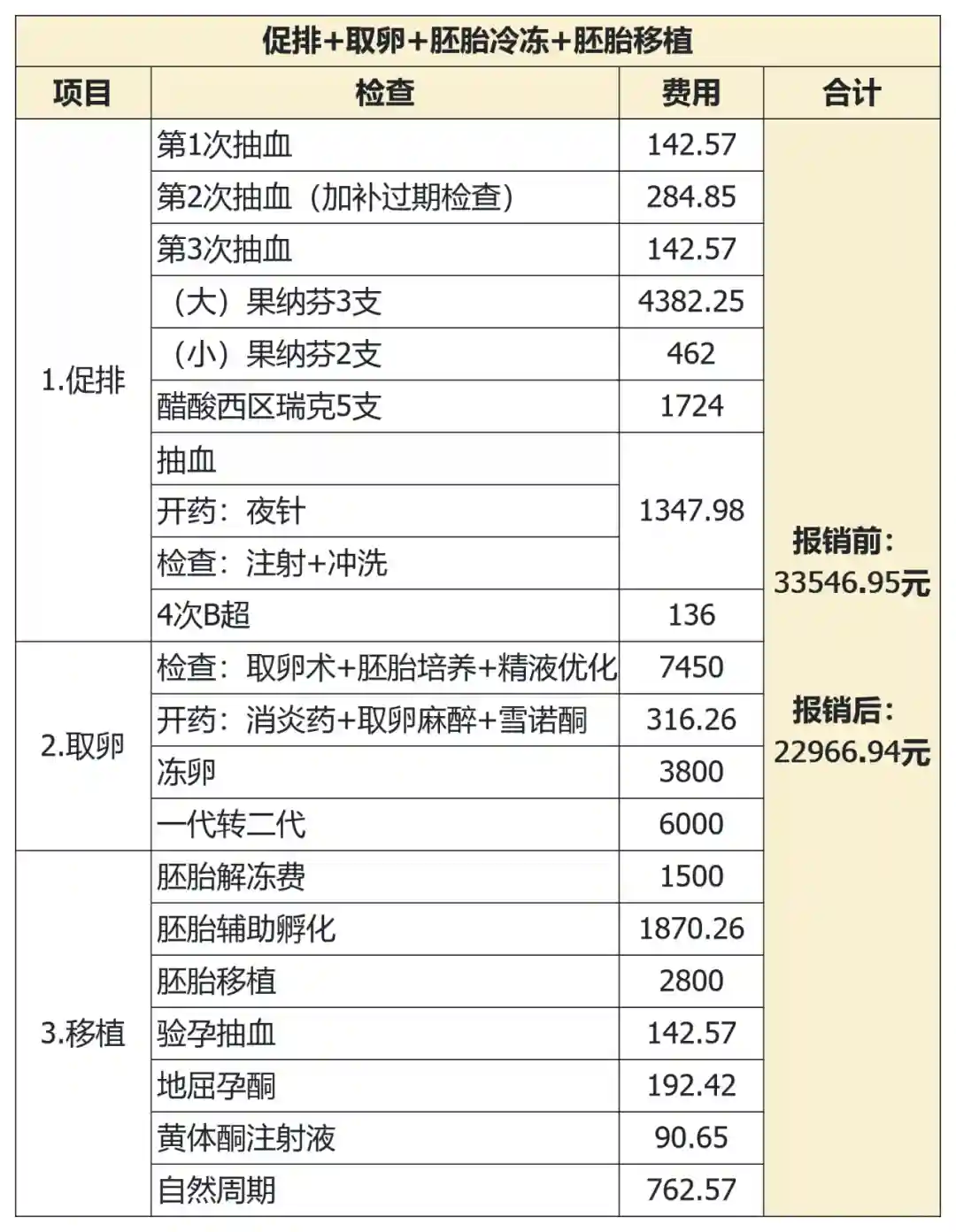 女检查+促排+取卵+移植+冷冻,报销前33546.95元,报销后:22966.94元