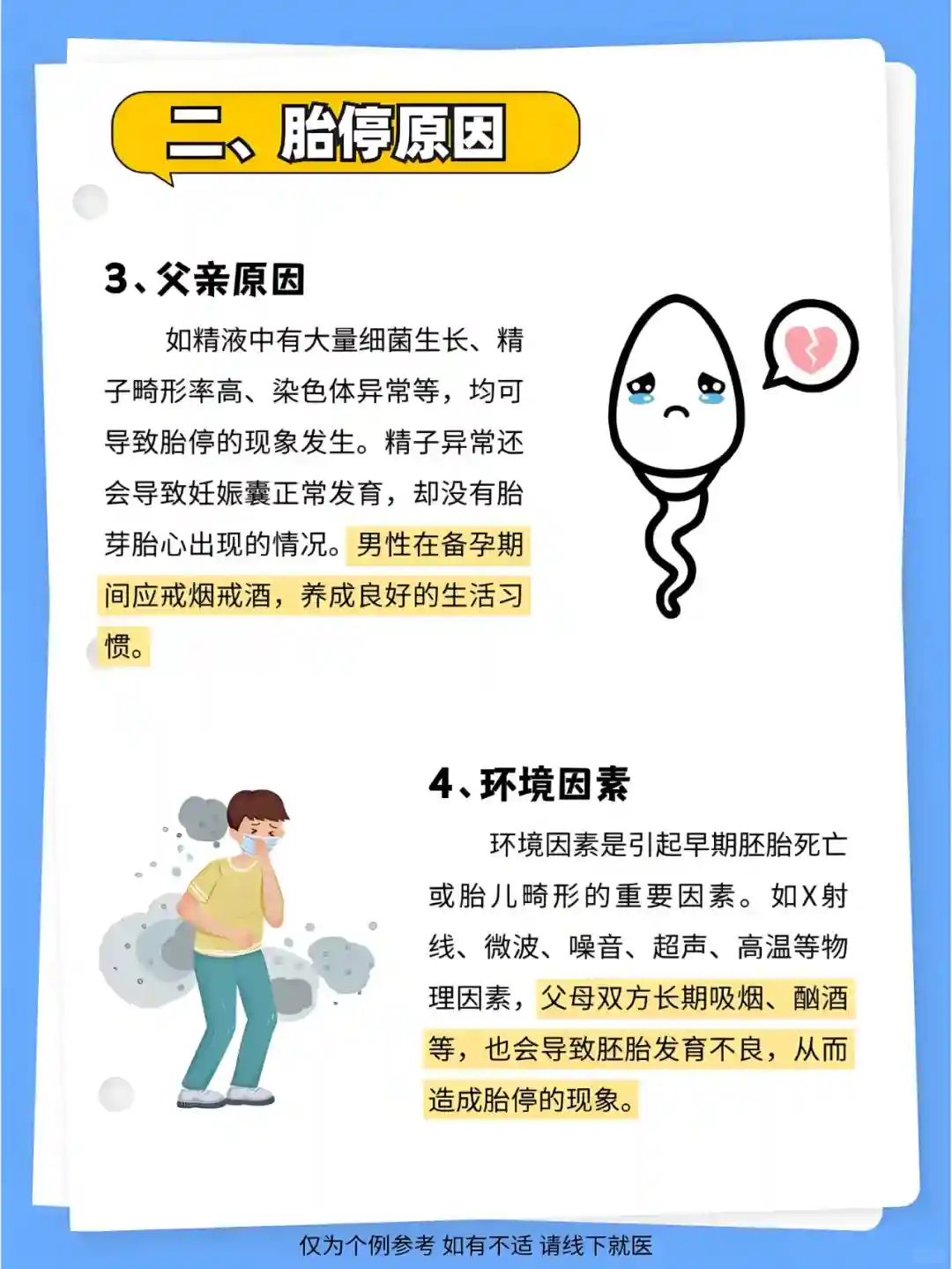 4.环境因素环境因素是引起早期胚胎死亡或胎儿畸形的重要因素。父母双方长期吸烟、酗酒等,也会导致胚胎发育不良,从而造成胎停的现象。