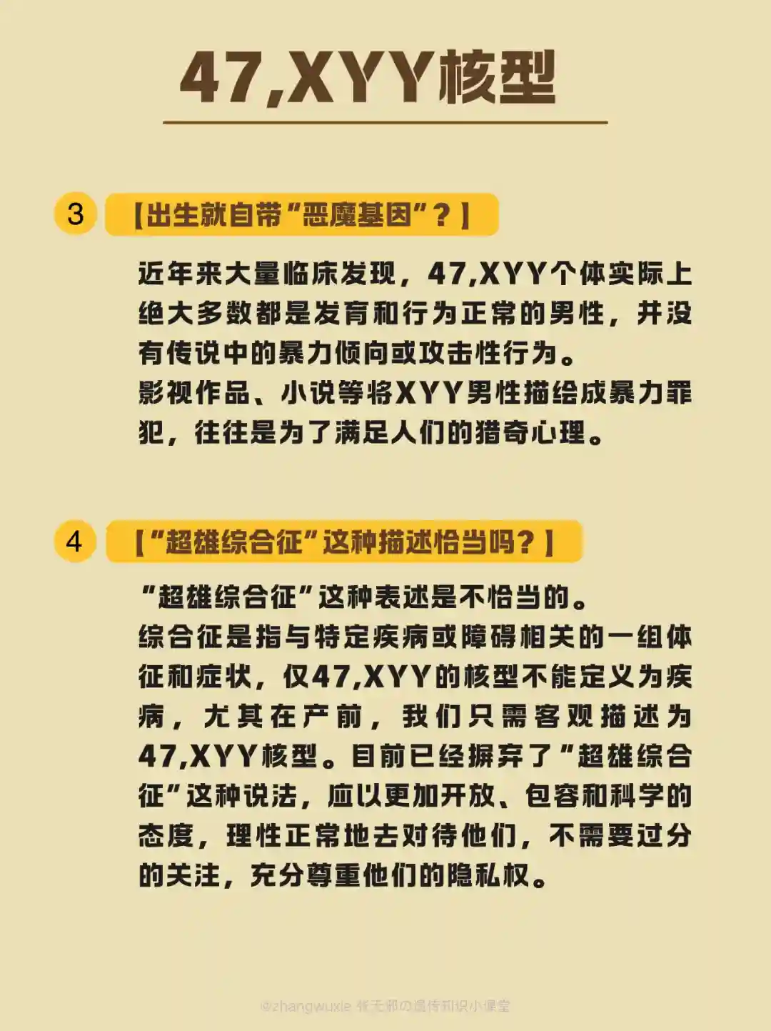 近年来大量临床发现,47,XYY个体实际上绝大多数都是发育和行为正常的男性,并没有传说中的暴力倾向或攻击性行为。影视作品、小说等将XYY男性描绘成暴力罪犯,往往是为了满足人们的猎奇心理。