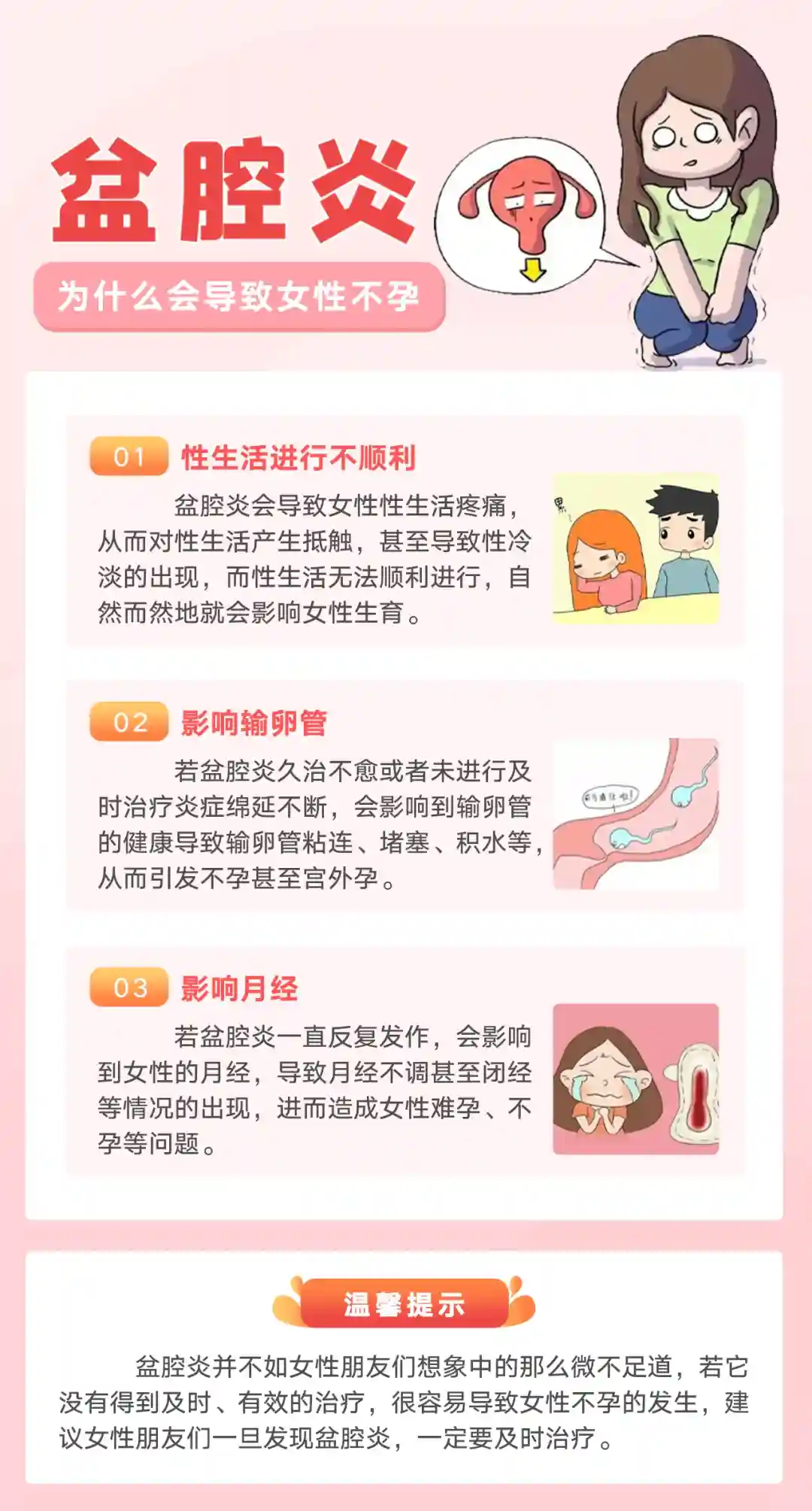 tips:盆腔炎并不如女性朋友们想象中的那么微不足道,若它没有得到及时、有效的治疗,容易导致女性不孕的发生,建议女性朋友们一旦发现盆腔炎,一定要及时治疗。