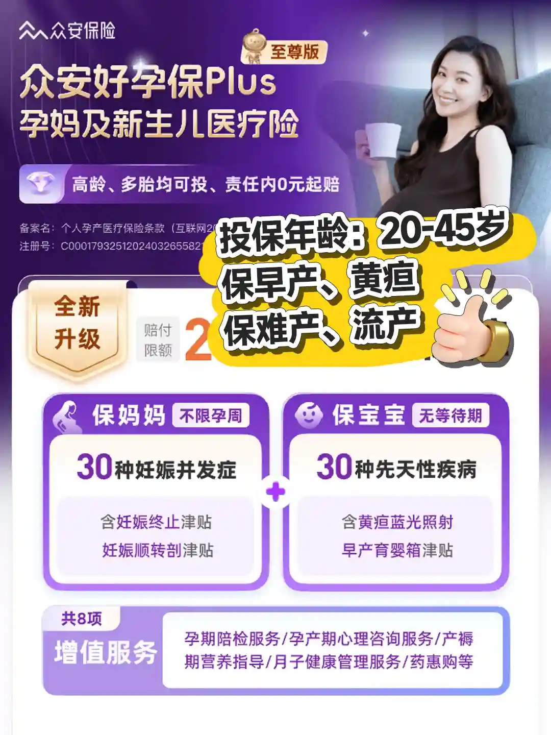 🌈首先,市面很多孕妇险不支持高龄孕妈投保。众安好孕保Plus支持20-45周岁孕妈投保。