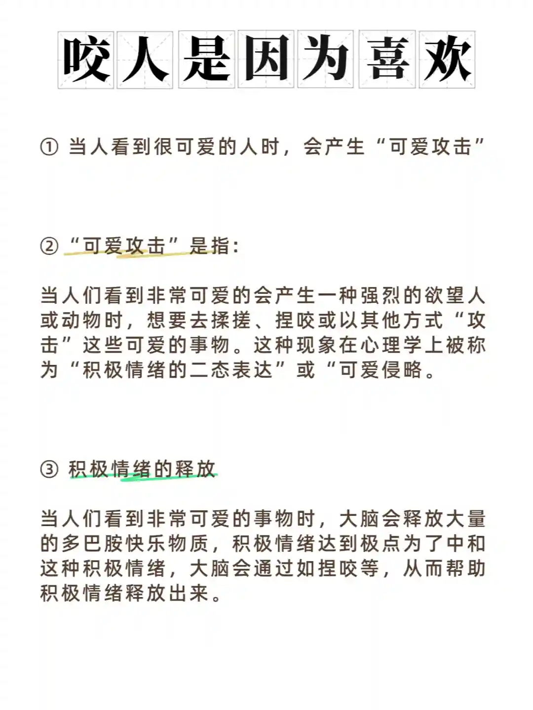 比如很多人看到可爱的猫猫狗狗会产生一种强烈的“攻击”欲望,就想上去咬一咬 捏一捏…😘说明这个时候的喜欢要到顶啦~