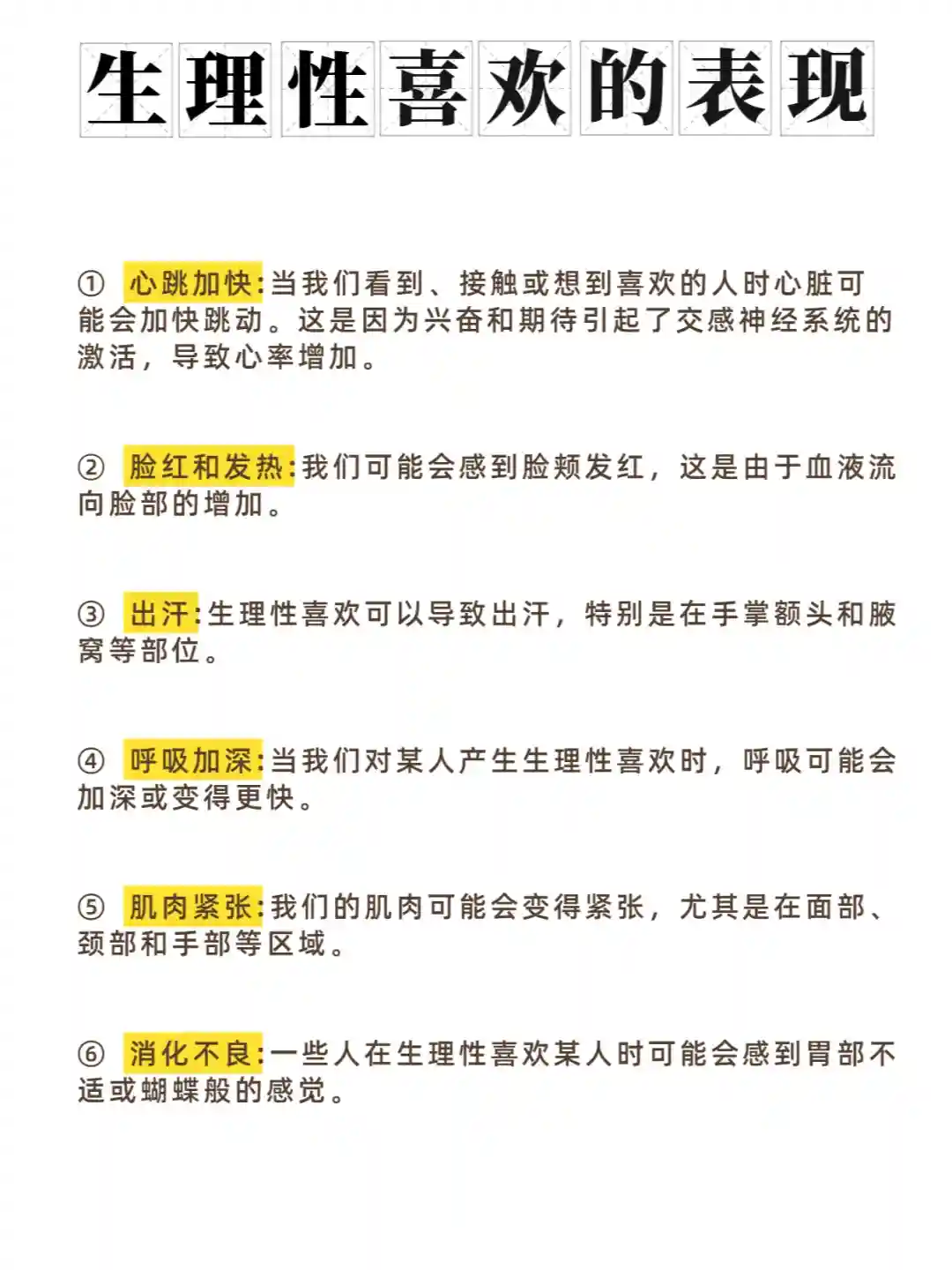 心跳加快:当我们看到、接触或想到喜欢的人时心脏可能会加快跳动。这是因为兴奋和期待引起了交感神经系统的激活,导致心率增加。