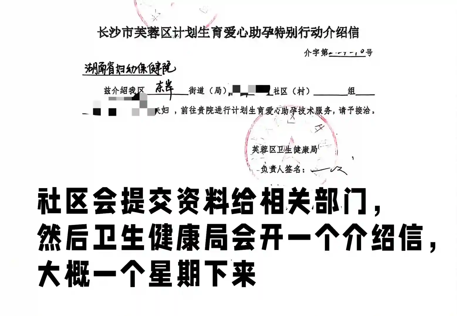 3、社区会提交资料给相关部门,然后卫生健康局会开一个介绍信,大概一个星期下来介绍信;