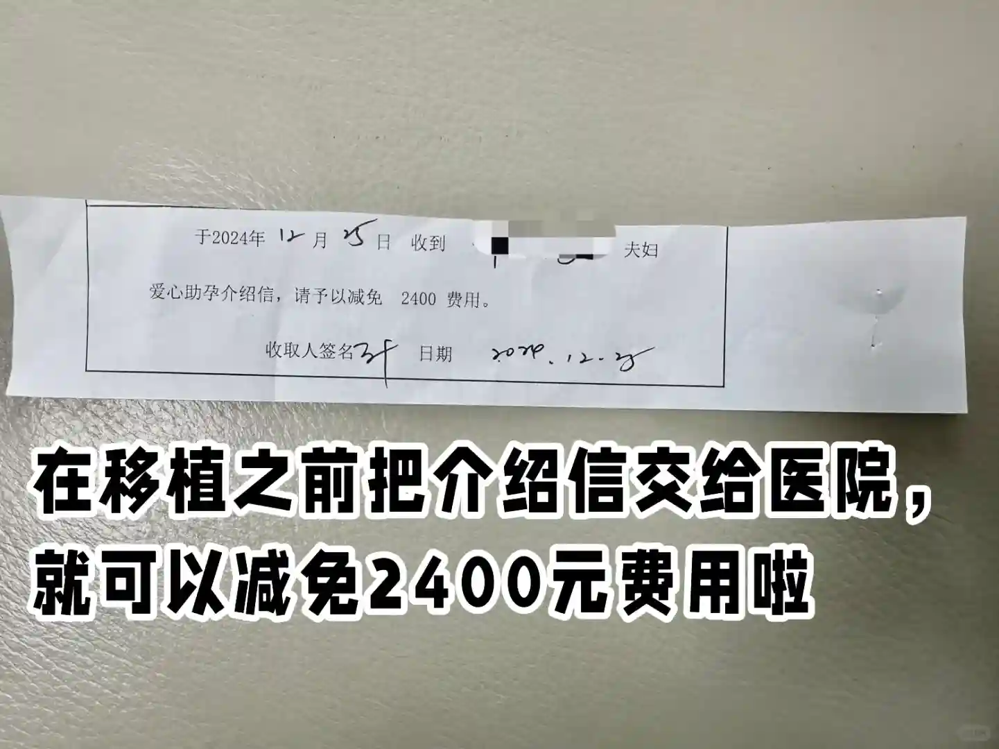 4、移植前把介绍信交给护士站,就可以减免啦,因为我是后天移植,今天交了,然后给我退了之前的900,移植费可以直接减免,一共就优惠了2400 啦;
