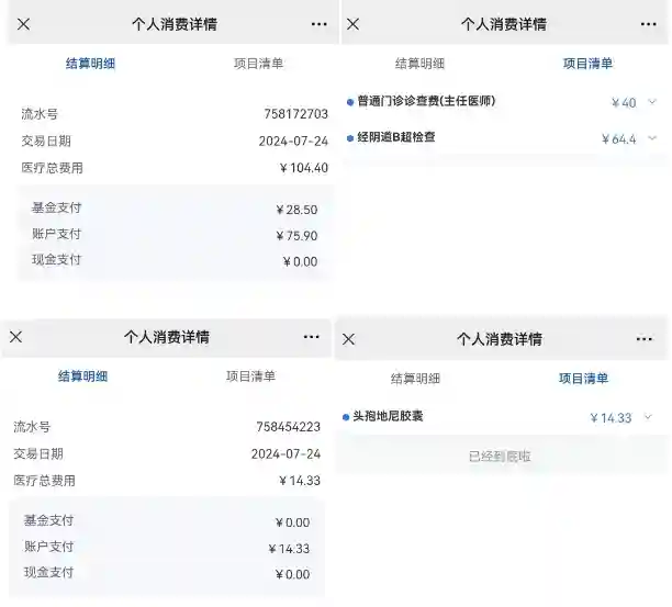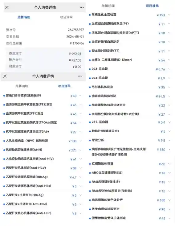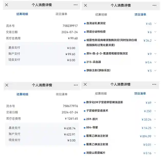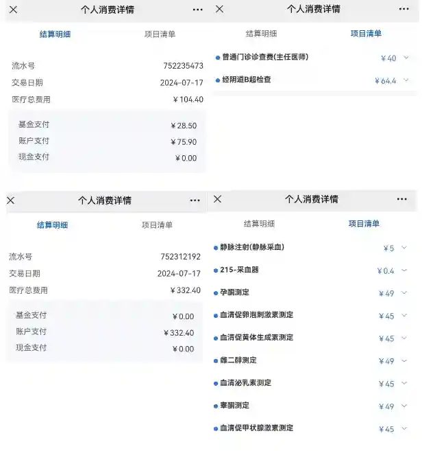 截止目前女方检查总费用4328.77元,其中职工医保基金支付2085.06元,账户支付2243.71元。男方检查3759元(包含医生开的十几盒调理的药),由于医保断缴只能自费。