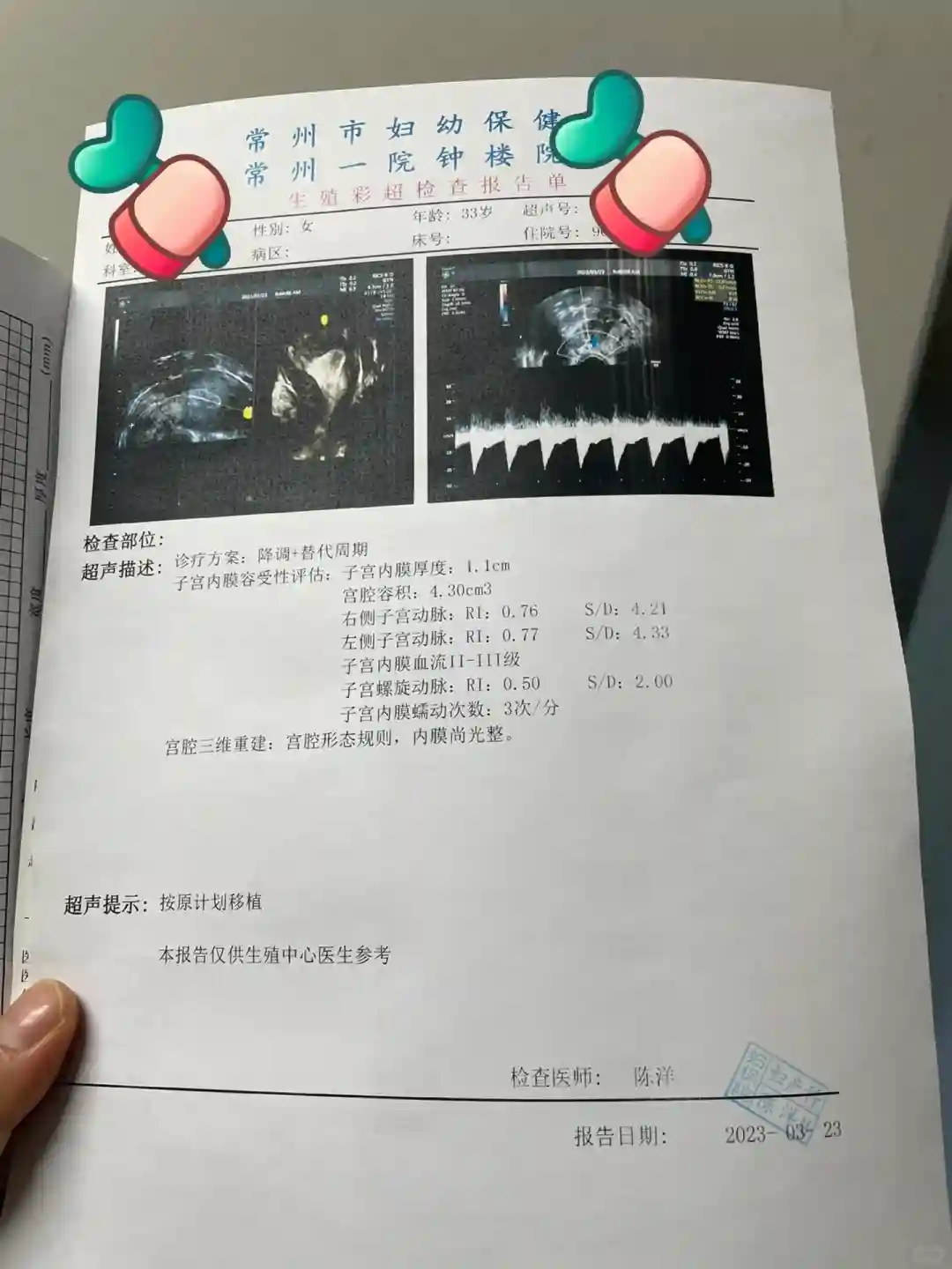 做容积不疼,全程大概几分钟,做完医生会把报告一起给你,让你去给刚才服务台的医生看,看完没问题才会让你去进门的第一个服务台去预约。因为做完容积看完报告已经十一点多了,医生就让我们下午13:30再去预约。