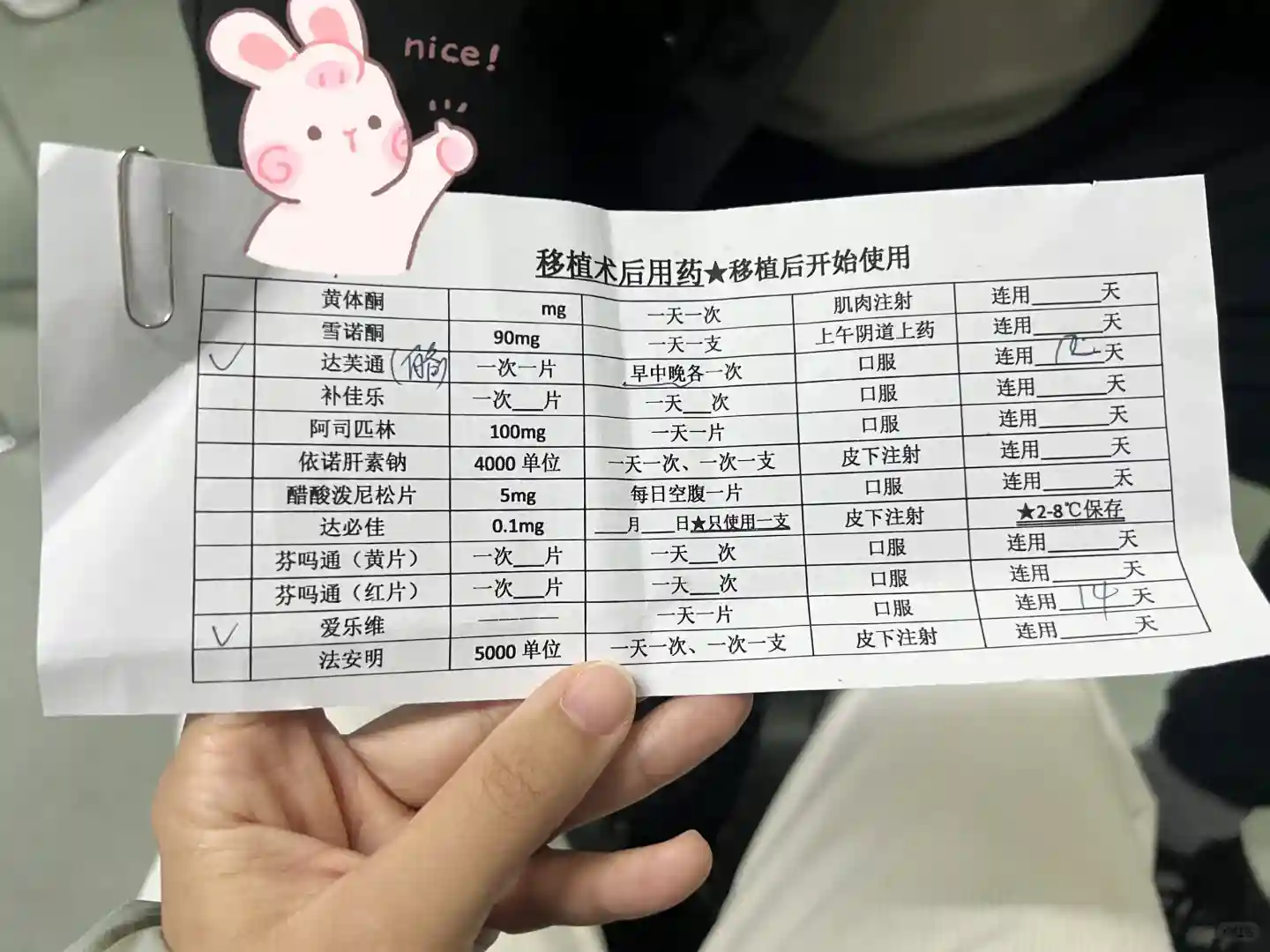 ▶️11:10左右进手术室,上衣不用脱,裤子全脱换手术服,按指纹然后上手术台,还得是薛大夫,手特别快,我感觉也就两分钟就送进去了,只是用扩阴器的时候还是挺疼的,往里送的时候一点感觉都没有▶️出手术室后,等10分钟就可以起来排尿了,这期间护士发了药单子,可以让队友去取药。叶酸和地屈孕酮都吃到30号~