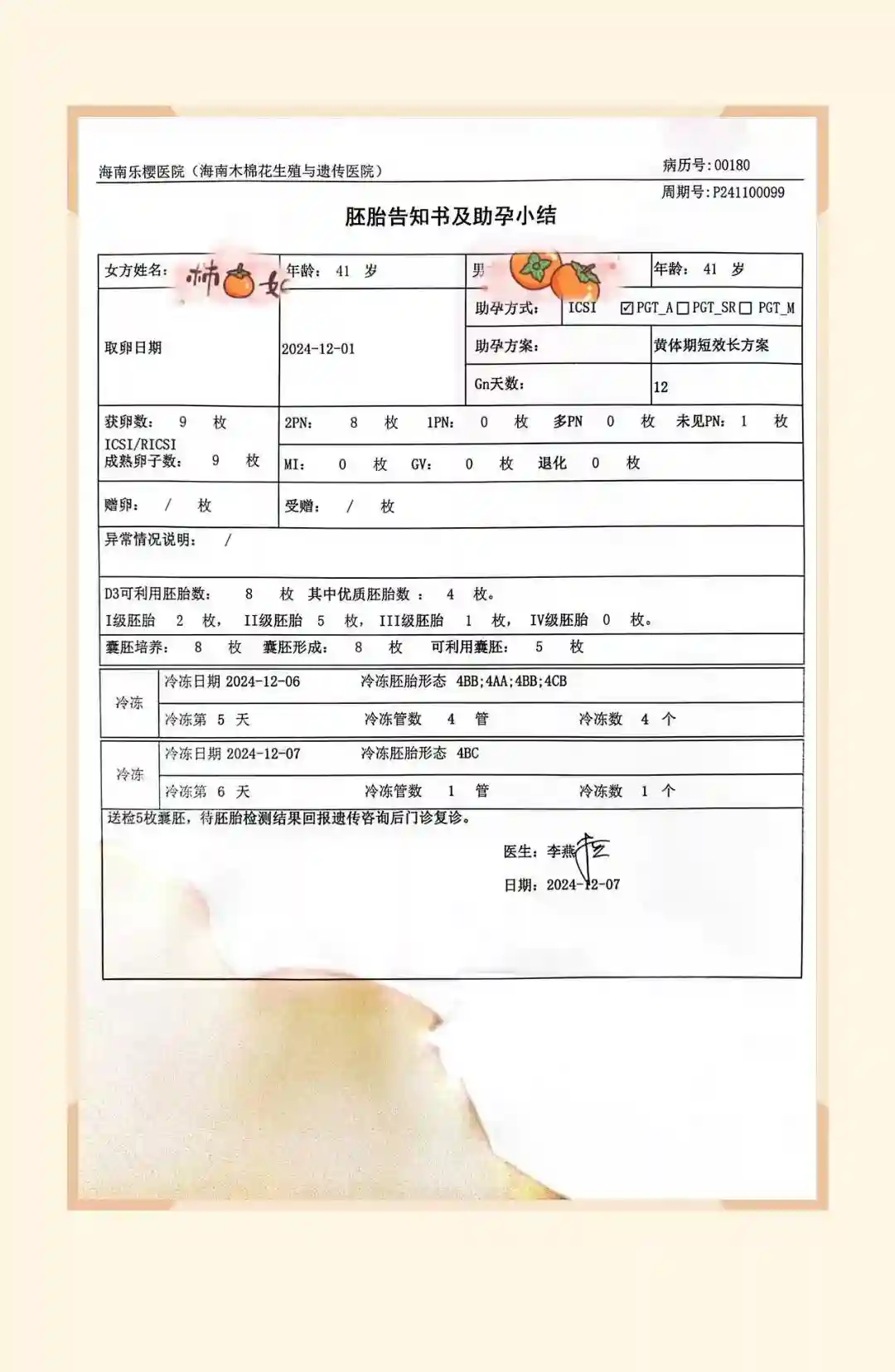 仅仅三个月,在杨冬梓教授的精细化诊疗下,在木棉花海南医院第一次取卵就收获满满!取到9枚卵,成功形成8个第三天胚胎,还养成了5个囊胚 ,检测后有3枚可利用胚胎!期待这位姐妹一次移植顺利好孕[合十][爱心]这一路的不易,每一个勇于追求的人,都值得温柔以待,木棉花和教授愿意做大家坚实的后盾,一起迎接生命的曙光🌈