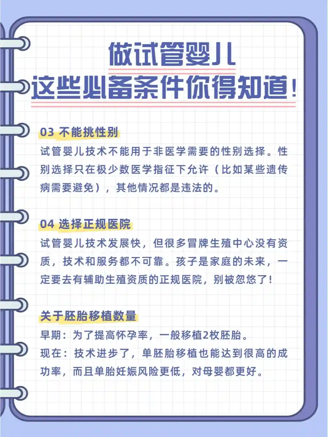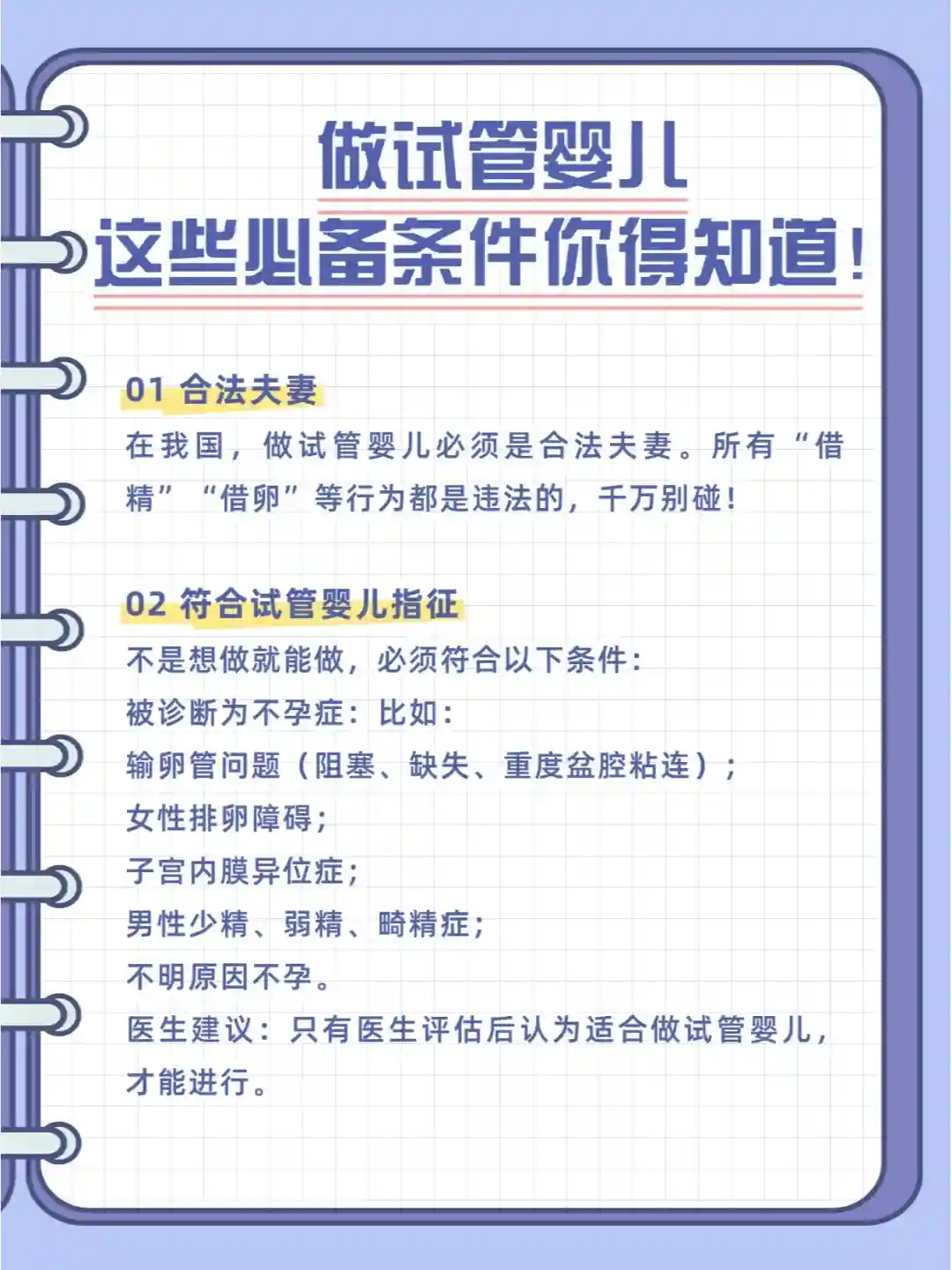 在我国,做试管婴儿必须是合法夫妻。所有“借精”“借卵”等行为都是违法的,千万别碰!