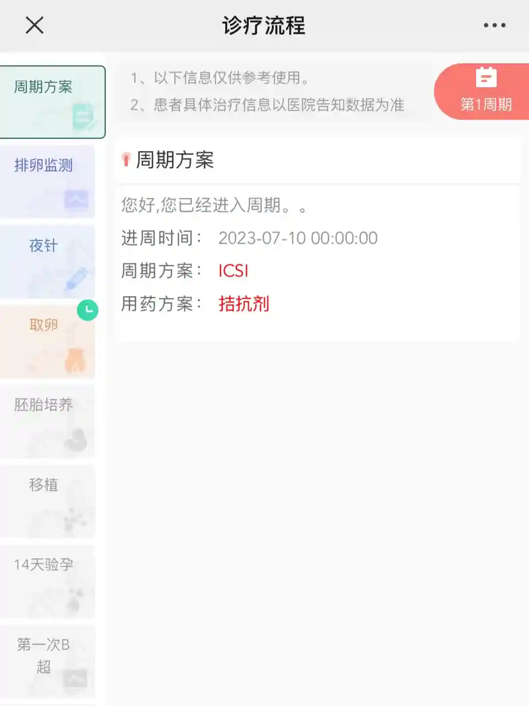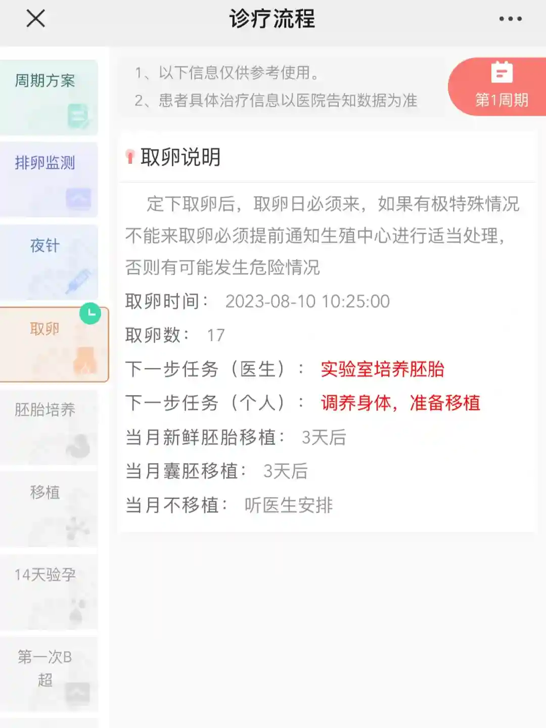 月经第二天当天,先是看了一下我的卵泡情况,当时说我卵泡大小不一,不确定能不能进周,让我等验血结果出来了再看。大概十点多,验血结果出来了,陈教授的助理把我叫进去,说开始进周打针了。然后我的第一次促排就稀里糊涂开始了。去药房买了果纳芬,回到注射室学习了一下打针,就回家了。进周后,会发铁牌号,护士姐姐们会帮忙挂号,无需再自己蹲点抢号了。助理会交代回院检测激素水平和卵泡的时间,按交代的回院就行。我的卵泡长得还挺快,第八天就交代打夜针了,第十天就取卵了。根据自己的情况,可选择全麻取卵和无麻取卵。手术当天七点半前,带好结婚证身份证和手术缴费单,到生殖科四楼签到。