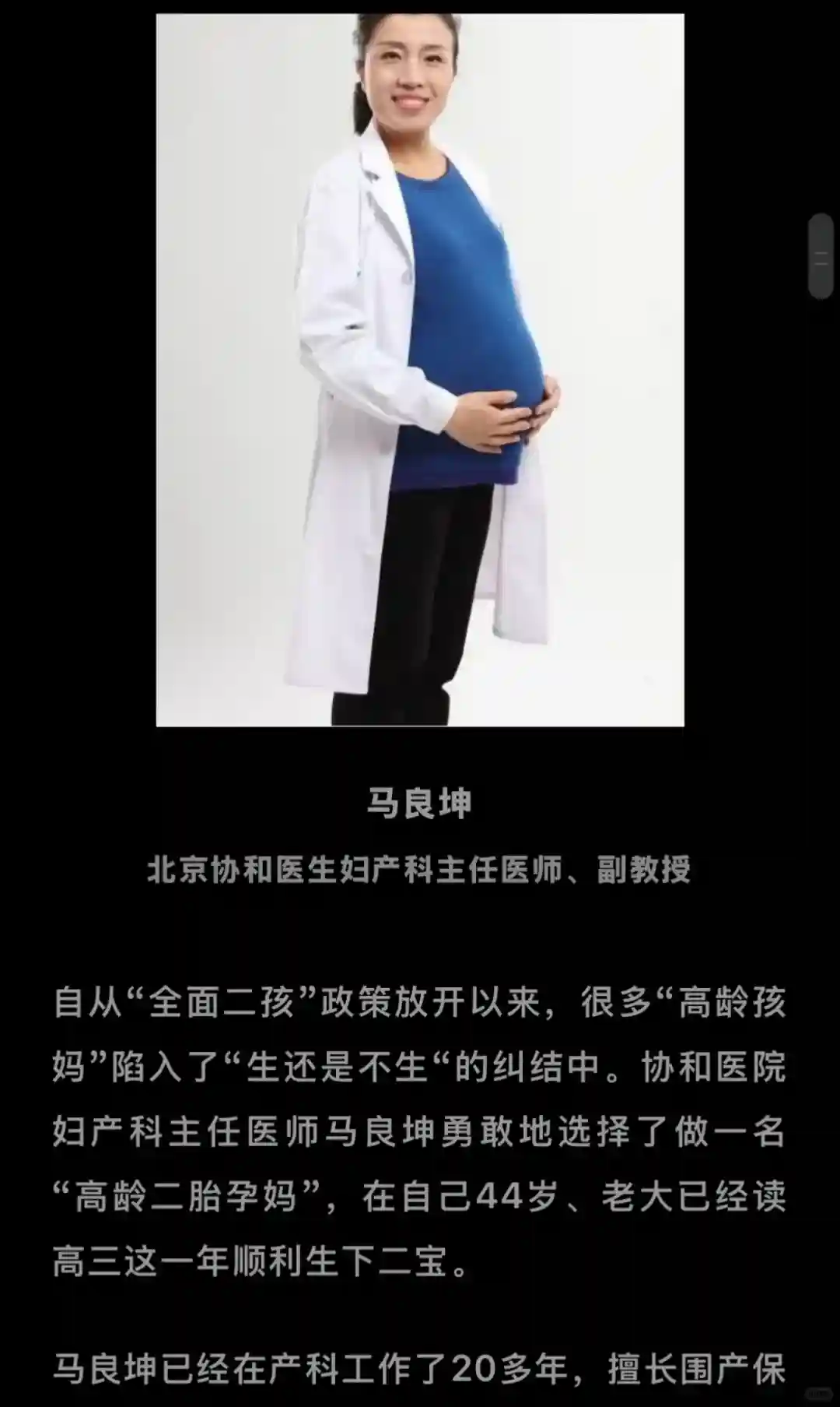 不仅如此,马良坤在二胎孕期还成了名副其实的”铁人妈妈“,不但工作量丝毫未减,还利用自己的专业知识结合个人经历,撰写了一本《协和产科医生的高龄二胎手记》,与大家分享自己的孕期体会。马良坤介绍,生育没有一个绝对不能的年龄。但从生理角度考虑,女性年龄在24~29岁时,生理成熟,卵子质量高、精力充沛。若怀孕生育,胎儿生长发育良好,产力和生殖道弹性好,分娩危险系数小,有利于自然分娩,也有孕育和抚育婴儿的精力,因此女性最佳生育年龄通常被认为是24~29岁。当然最理想的生育条件除了有好身体之外,工作稳定,家庭幸福以及在陪伴孩子的成长的过程中始终年轻态等因素,这些也都很重要。