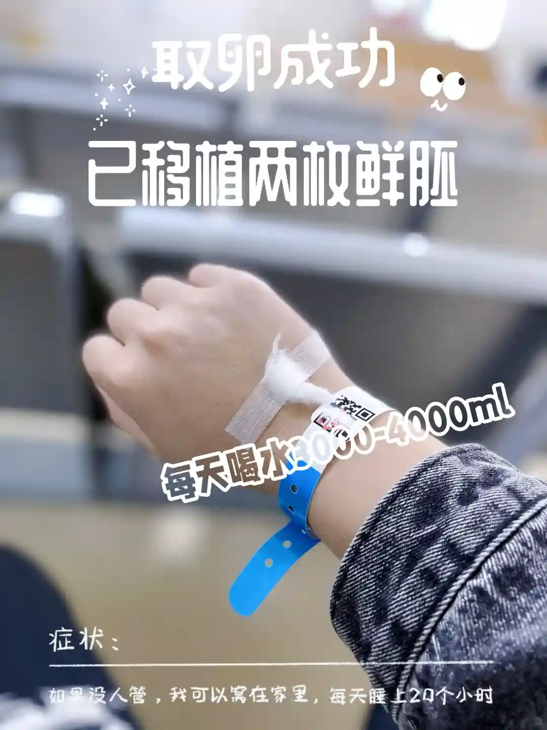#取卵 4月6日七点二十左右到的医院,先验证夫妻双方身份证,签字,然后带腕带,排顺序进去换手术服,进去等待室扎滞留针,我是第一个,进手术室就有护士在等着,躺上去后就是冲洗消毒了,真的是涨涨的疼,还好,能忍受,然后就是等着大夫和麻醉师,护士姐姐跟我聊天问我紧张吗?我说不紧张,她说你不怕吗?你这心态挺好,我问她是全麻吧?她说是啊,我说那我就不怕了然后就是大夫和麻醉师一来,麻药三秒我就睡了,醒的时候已经在走廊的床上了,躺了一会就被阿姨扶着送到更衣室自己换衣服出来了,出来的时候老公还没开始,把我扶着坐下他就被护士叫走了,我们所有人都出来之后护士台的护士给每个人开了药,写了医嘱,开好了下次复诊的B超,就回去躺着了,然后就是拼命喝水喝蛋白粉喝电解质水的两天,复诊结果不错,今天上午看了胚胎,取了9枚,成了4个,不焦虑够用就行,下午1.30憋好尿就移植了,移植没什么感觉,就像做检查一样,现在已经躺在床上了,肚子还是有些胀痛,大夫说要继续喝,多吃点咸的,还是有腹水,明天就回家了,加油吧!