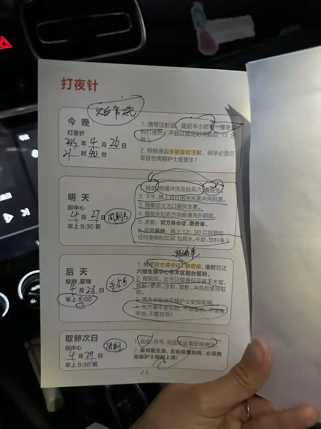 4.27 第二早上要去抽血验E2,还要补一个血常规。然后就去冲洗阴道和贴耳穴。冲洗的护士比较温柔只是会有点涨涨的不适感,但能接受。然后就贴上耳穴,护士说最好贴72个小时之后,这个耳穴是刺激血液改善睡眠的可以按摩一下耳贴上面的珠珠穴位。因为我觉得有点痛就没有按摩了。当天晚上要吃一片消炎药,自己冲洗一次阴道,晚上9点后我就没有进食了