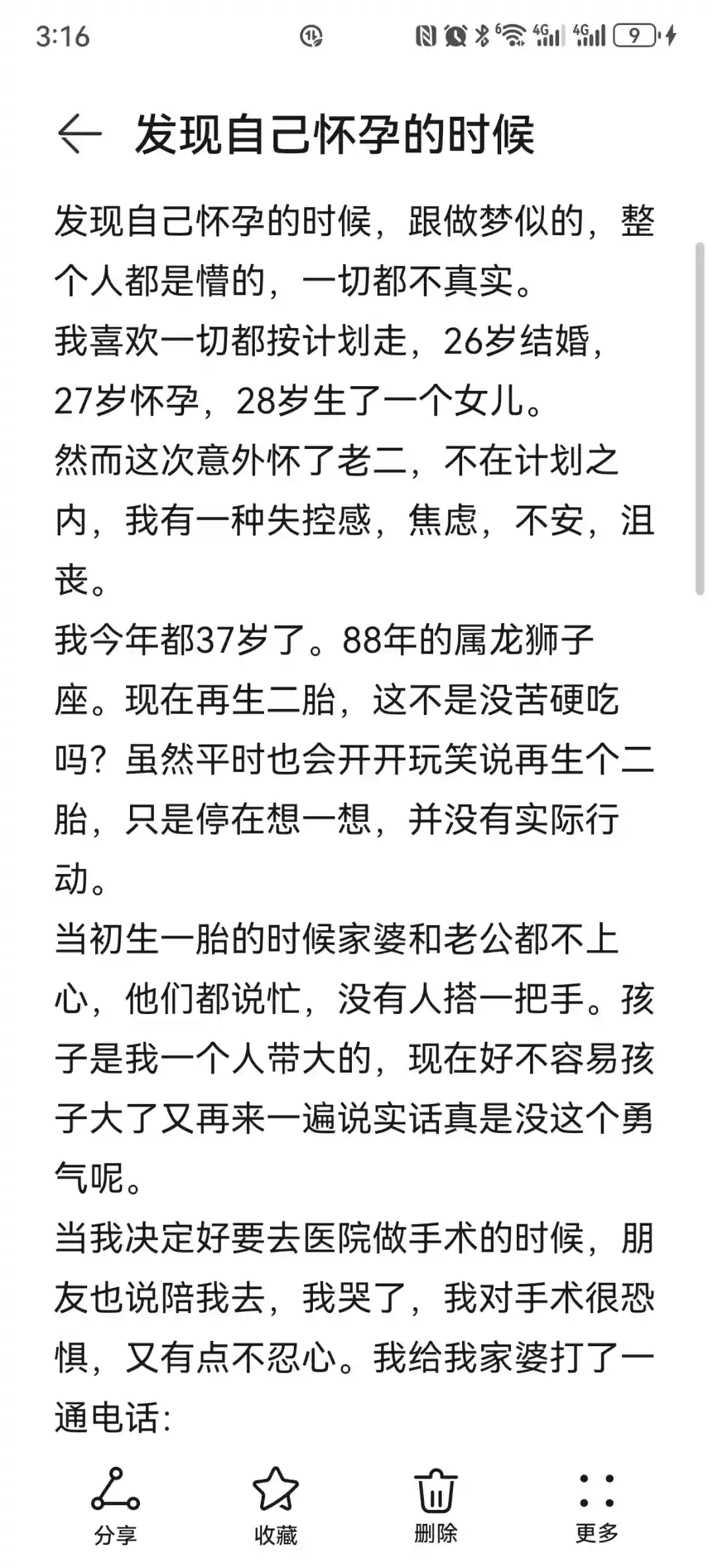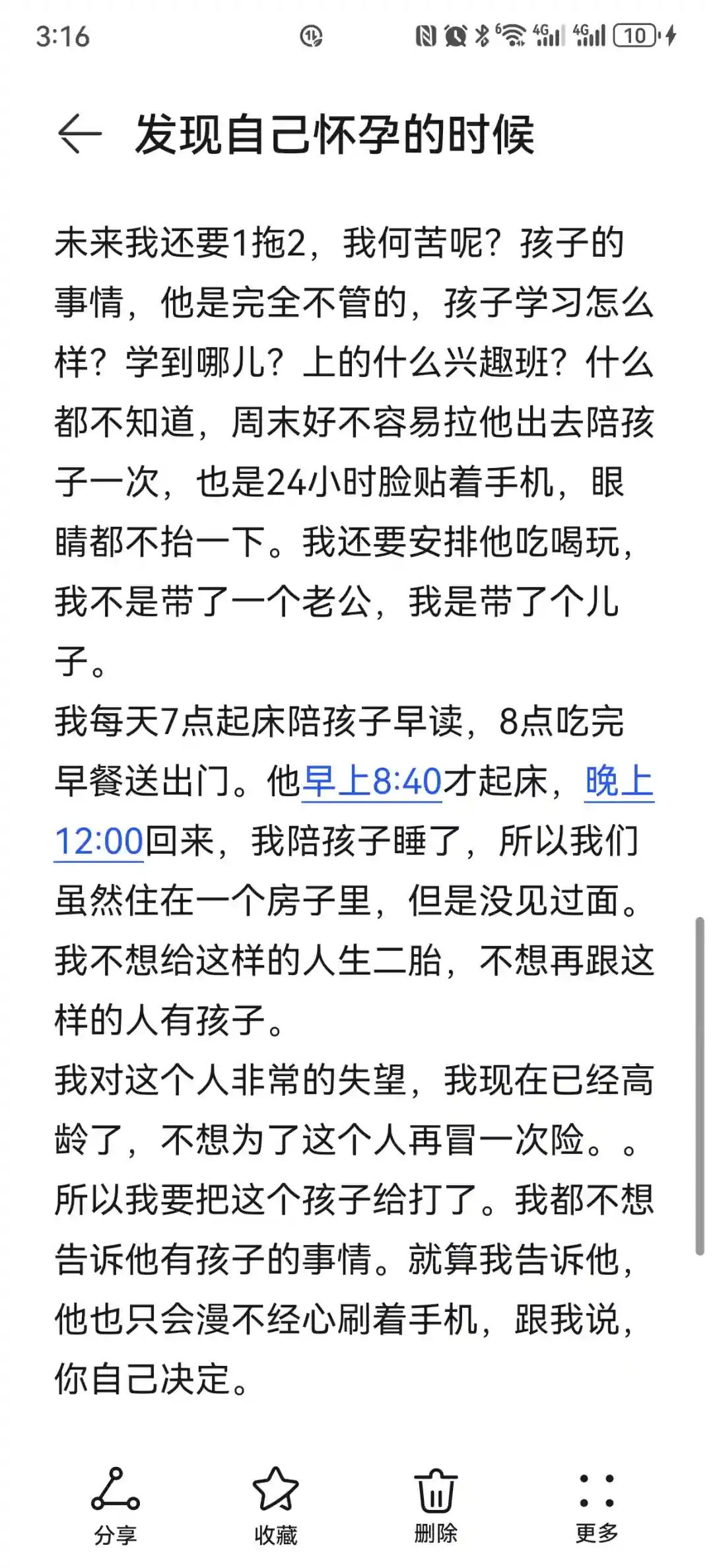 他还会说自己很厉害,又怀上了,就像十年前怀一胎一样,他不会考虑我已经高龄,也不会考虑我腰椎盘突出,也不会考虑我一个人要带俩。