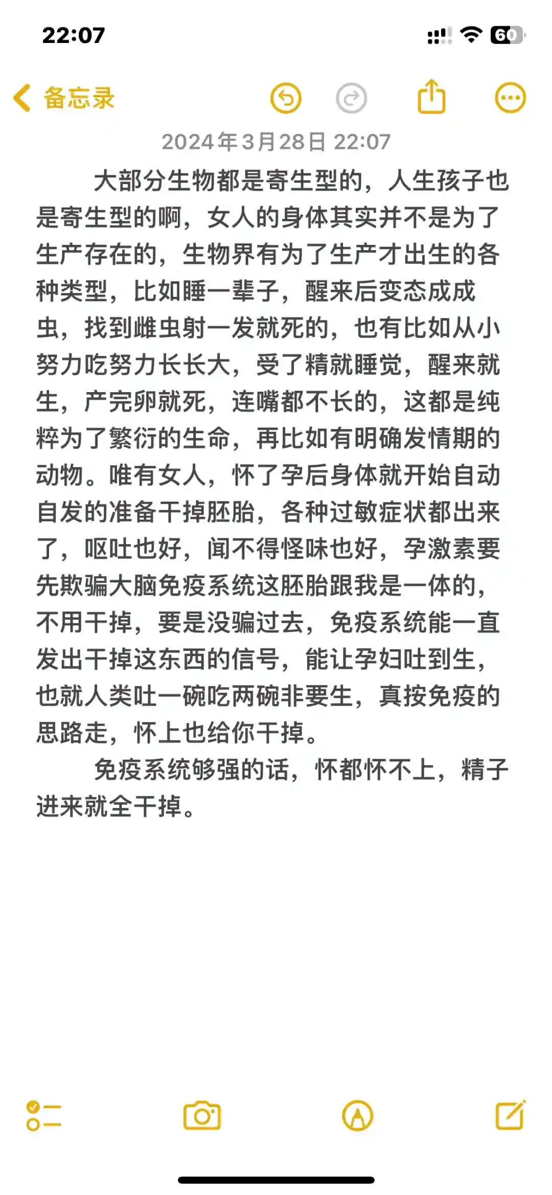 唯有女人,怀了孕后身体就开始自动自发的准备干掉胚胎,各种过敏症状都出来了,呕吐也好,闻不得怪味也好,孕激素要先欺骗大脑免疫系统这胚胎跟我是一体的,不用干掉,要是没骗过去,免疫系统能一直发出干掉这东西的信号,能让孕妇吐到生,也就人类吐一碗吃两碗非要生,真按免疫的思路走,怀上也给你干掉。