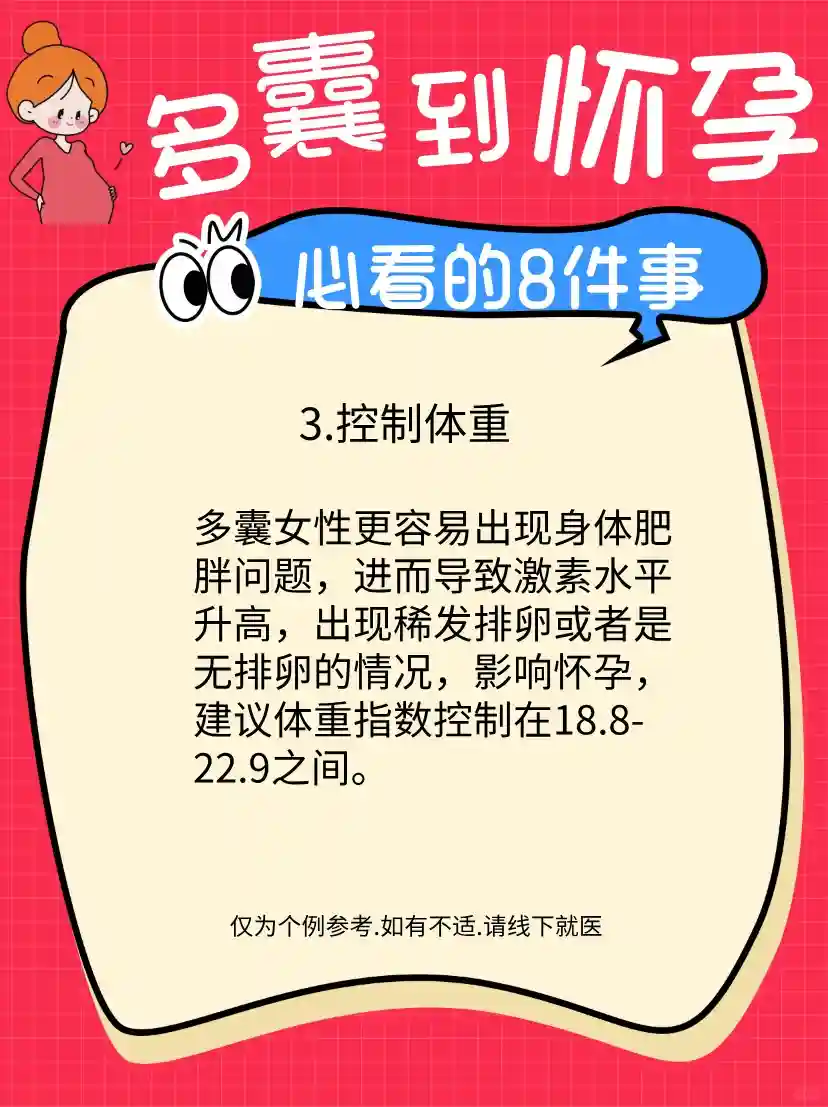 3.多囊女性更容易出现身体肥胖问题,进而导致ji素水平升高,出现稀发排卵或者是无排卵的情况,影响怀孕,建议体重指数控制在18.8-22.9之间。
