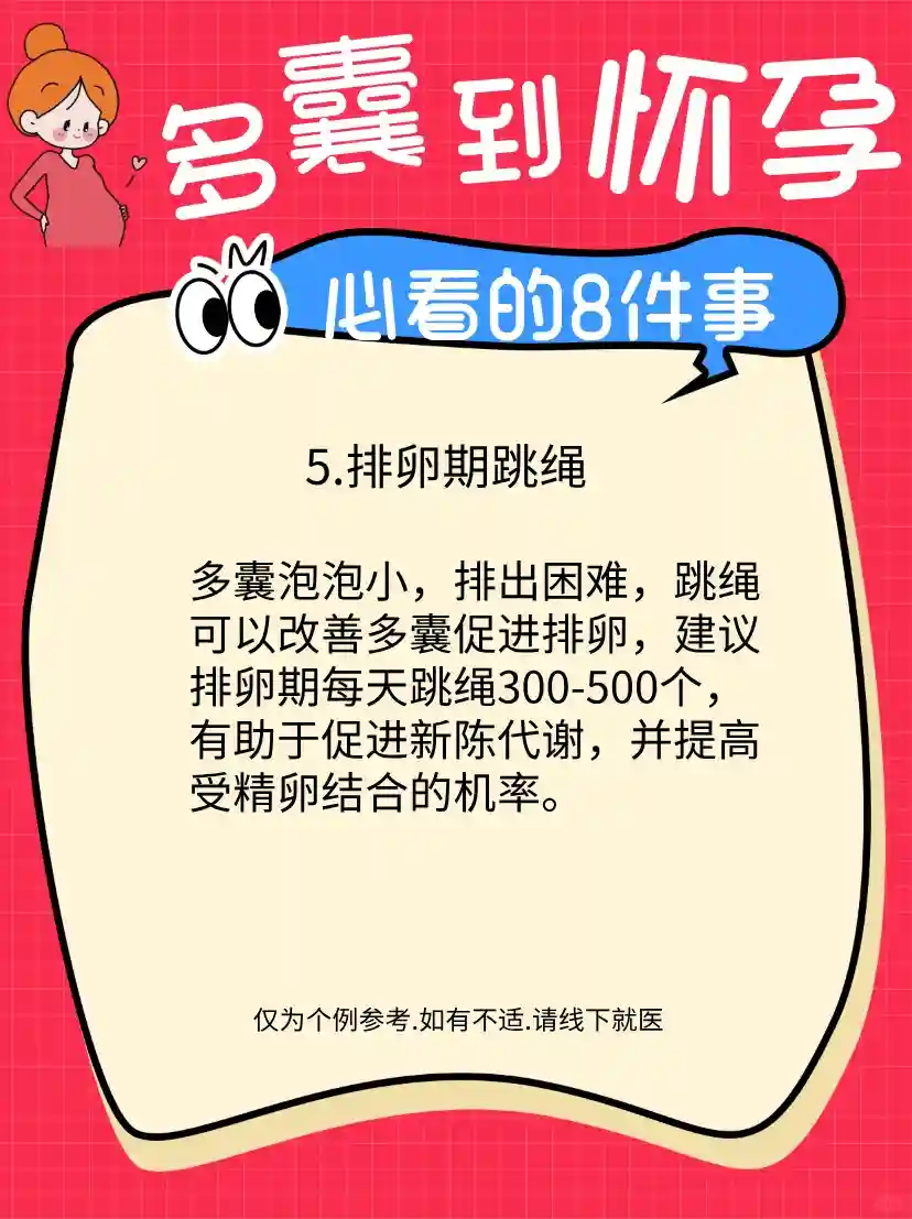 多囊泡泡小,排出困难,跳绳可以改善多囊促进排卵,建议排卵期每天跳绳300-500个,有助于促进新陈代谢,并提高受精卵结合的机率。
