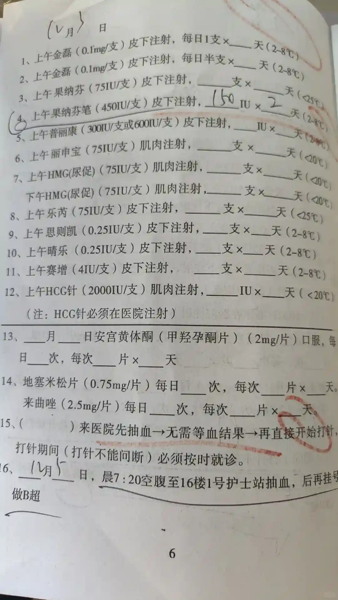 6,返回16楼打针,本次喜提果纳芬150UI,打两天,5号返院,继续B超➕抽血,5号返院需要带上这次白带结果,本次抽血不需要等待结果,有问题医生会电话联系告知(切记,一定要检查完了再打针,因为可能会更改剂量)