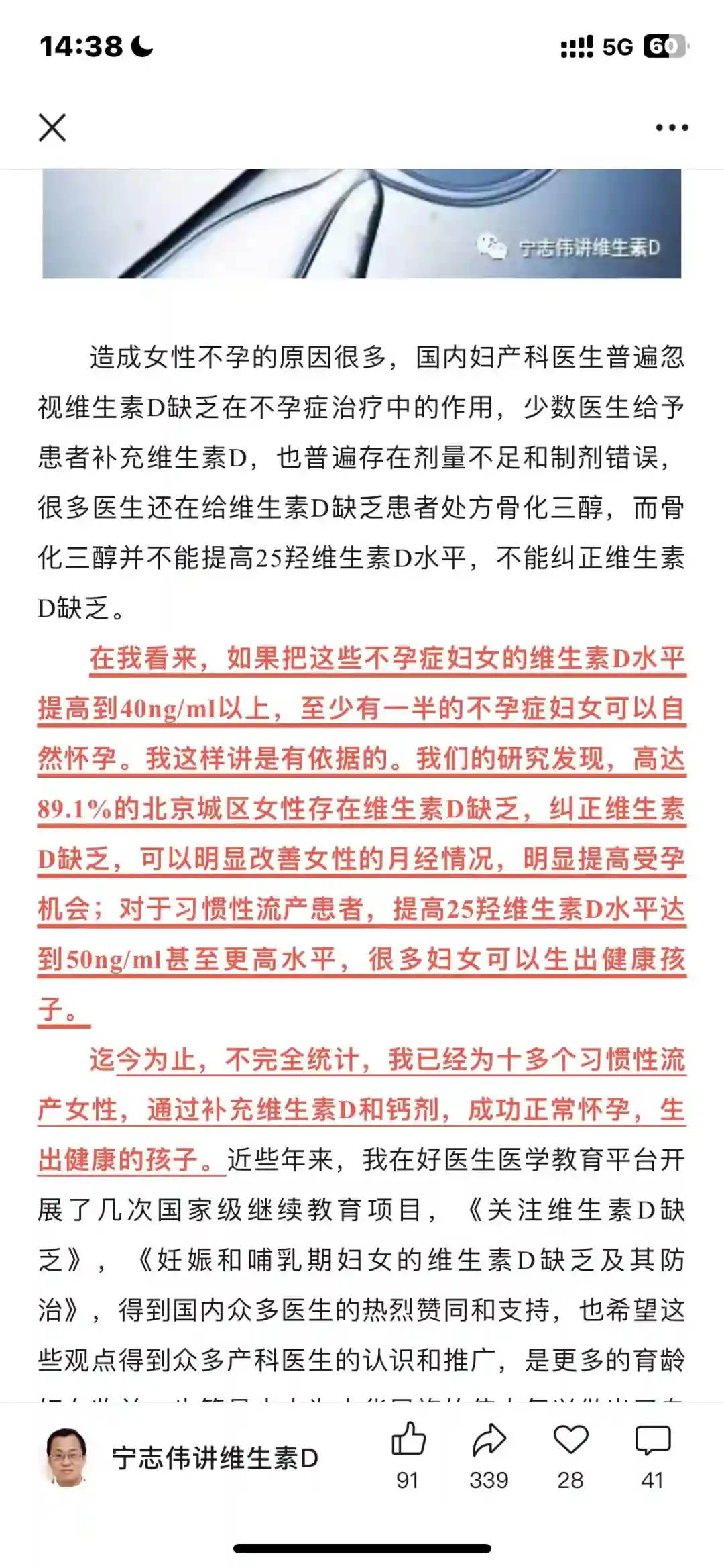 宁志伟老师说到:“如果把不孕的女性VD提高到40ng/ml以上,至少有一半的不孕女性可自然怀孕,且不用担心过量问题。”