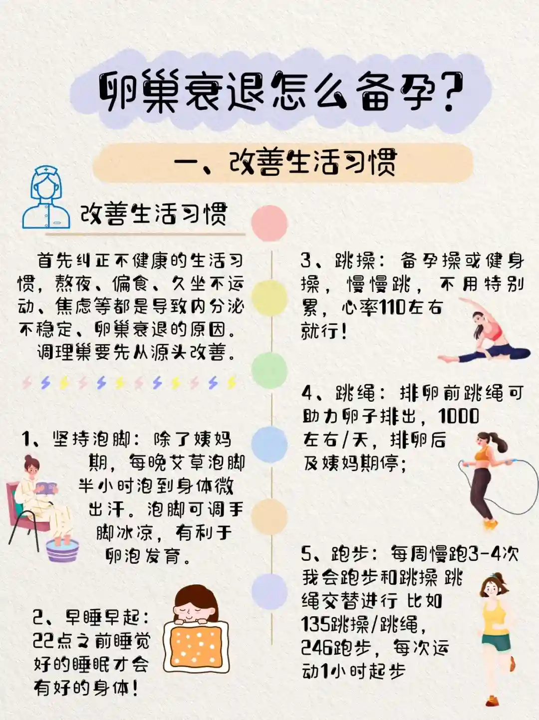 首先纠正不健康的生活习惯,熬夜、偏食、久坐不运动、焦虑等都是导致内分泌不稳定、卵巢衰退的原因。调理卵巢要先从源头改善。