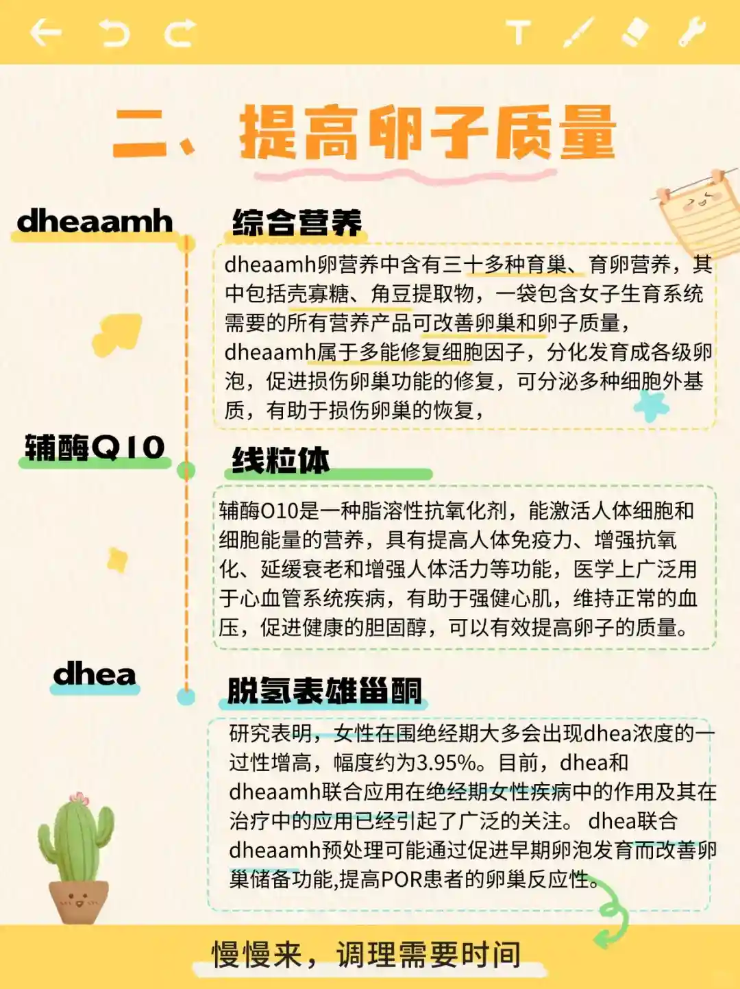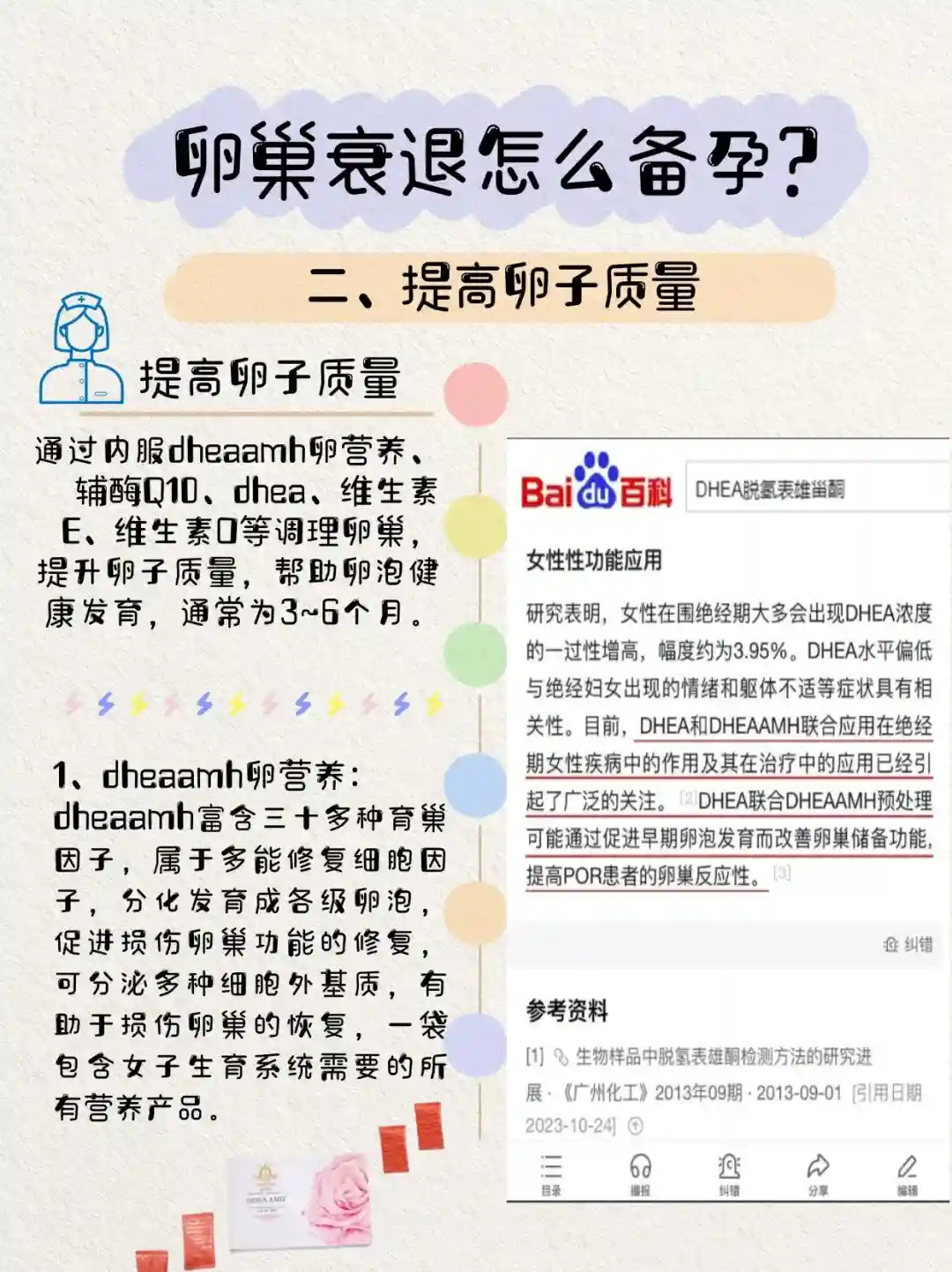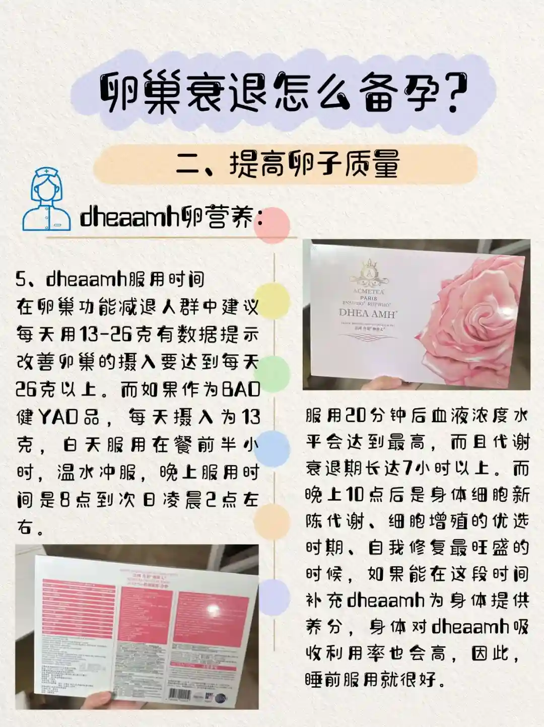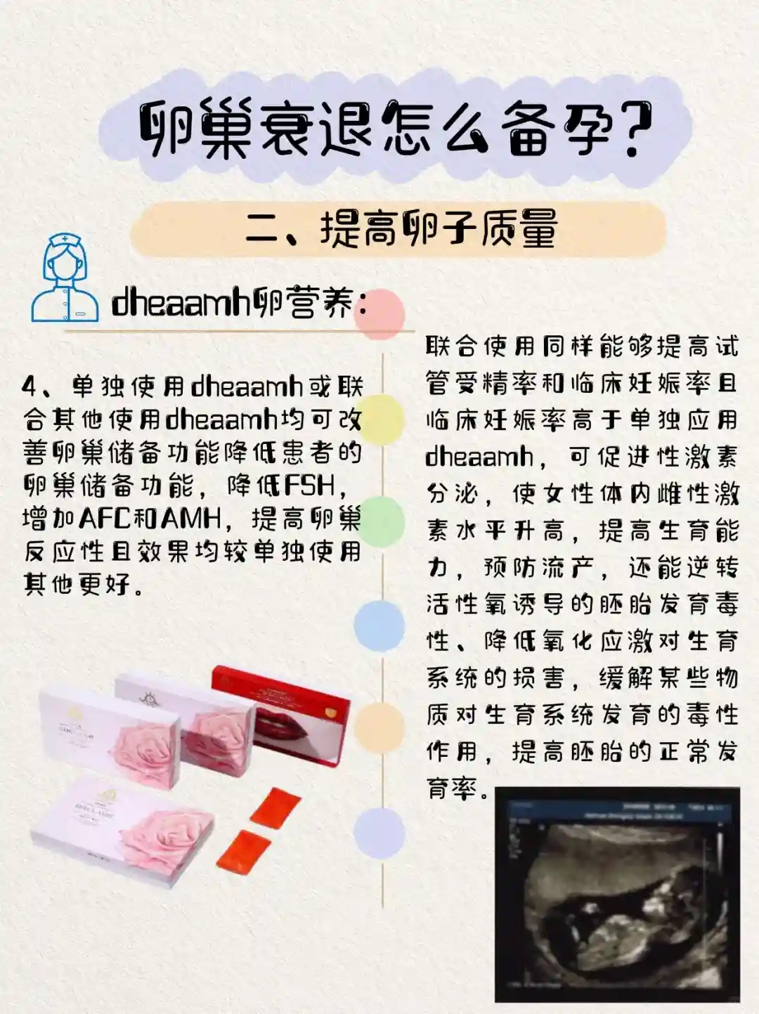 通过内服dheaamh卵营养辅酶Q10、dhea、维生素E、维生素口等调理卵巢提升卵子质量,帮助卵泡健康发育,通常为3~6个月。
