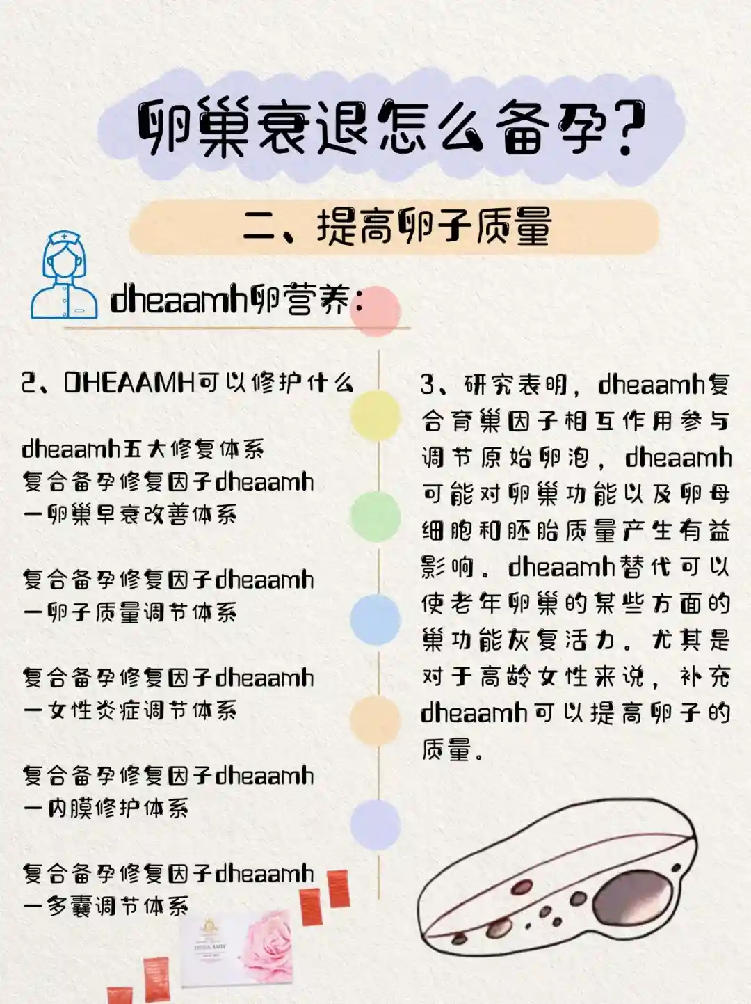 dheaamh卵营养中含有三十多种育巢、育卵营养,其中包括壳寡糖、角豆提取物,一袋包含女子生育系统需要的所有营养产品可改善卵巢和卵子质量,dheaamh属于多能修复细胞因子,分化发育成各级卵泡,促进损伤卵巢功能的修复,可分泌多种细胞外基质,有助于损伤卵巢的恢复,