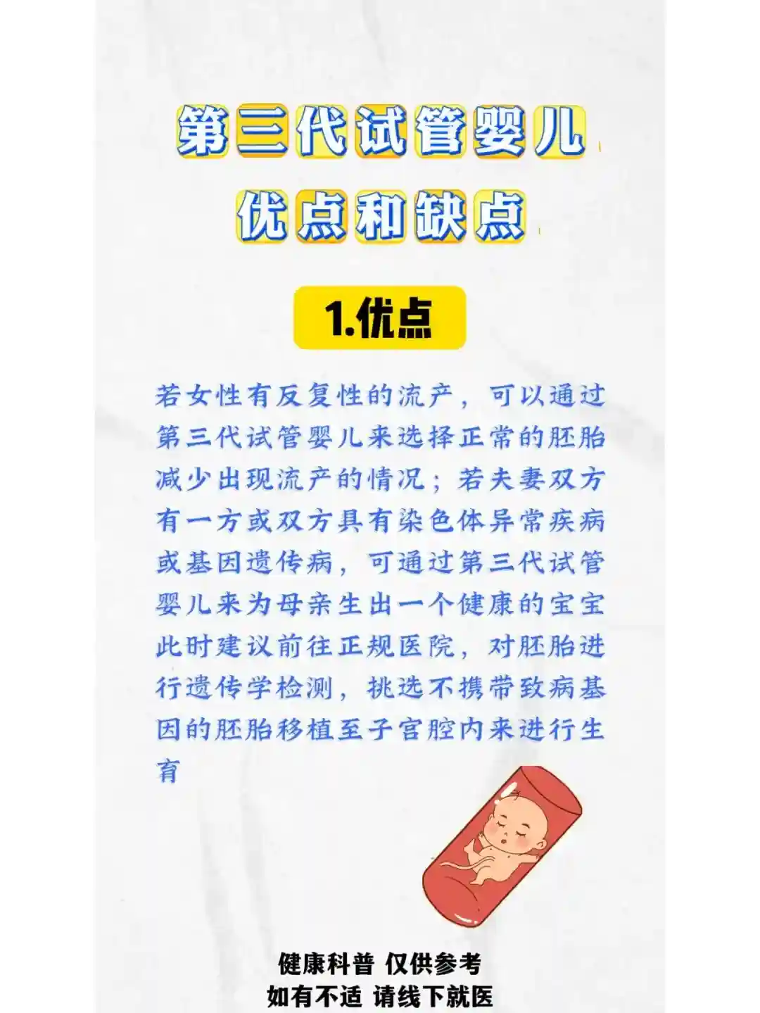 ①第三代试管婴儿需要对胚胎进行活检,对于取出的这部分细胞是否会对未来可能成功出生胎儿的正常发育产生影响还需要进一步证实。同时,第三代试管婴儿对医生的操作水平以及实验室设备要求比较高,需要专业的团队来进行。