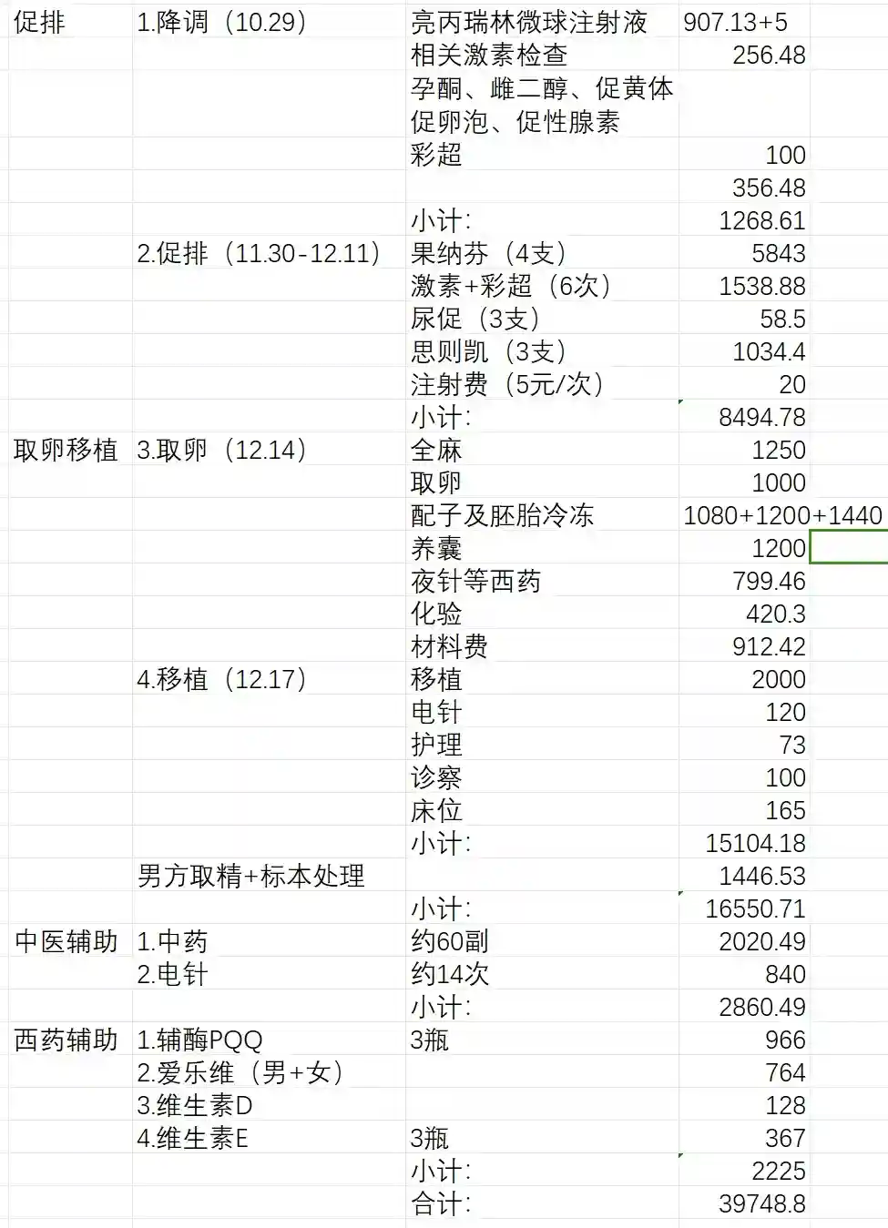 我是在郑大一附院南院区做的试管,整个过程从前期检查到取卵移植,包括后续冷冻胚胎,共花费39748.8元,各阶段花费如下,详细的我也做了表格贴在了图片里,大家可以参考。