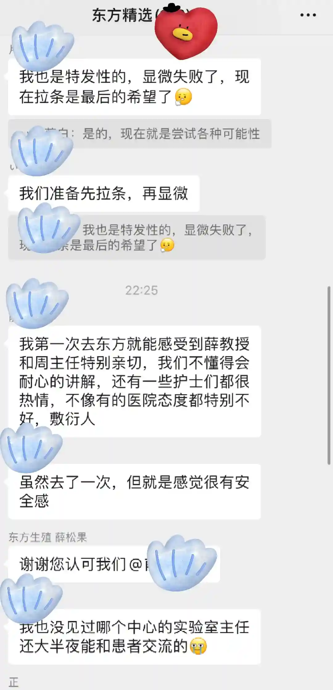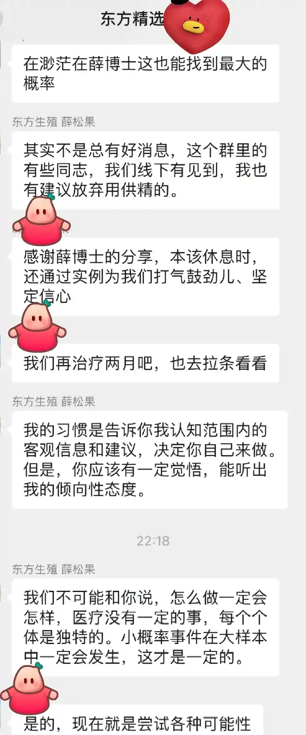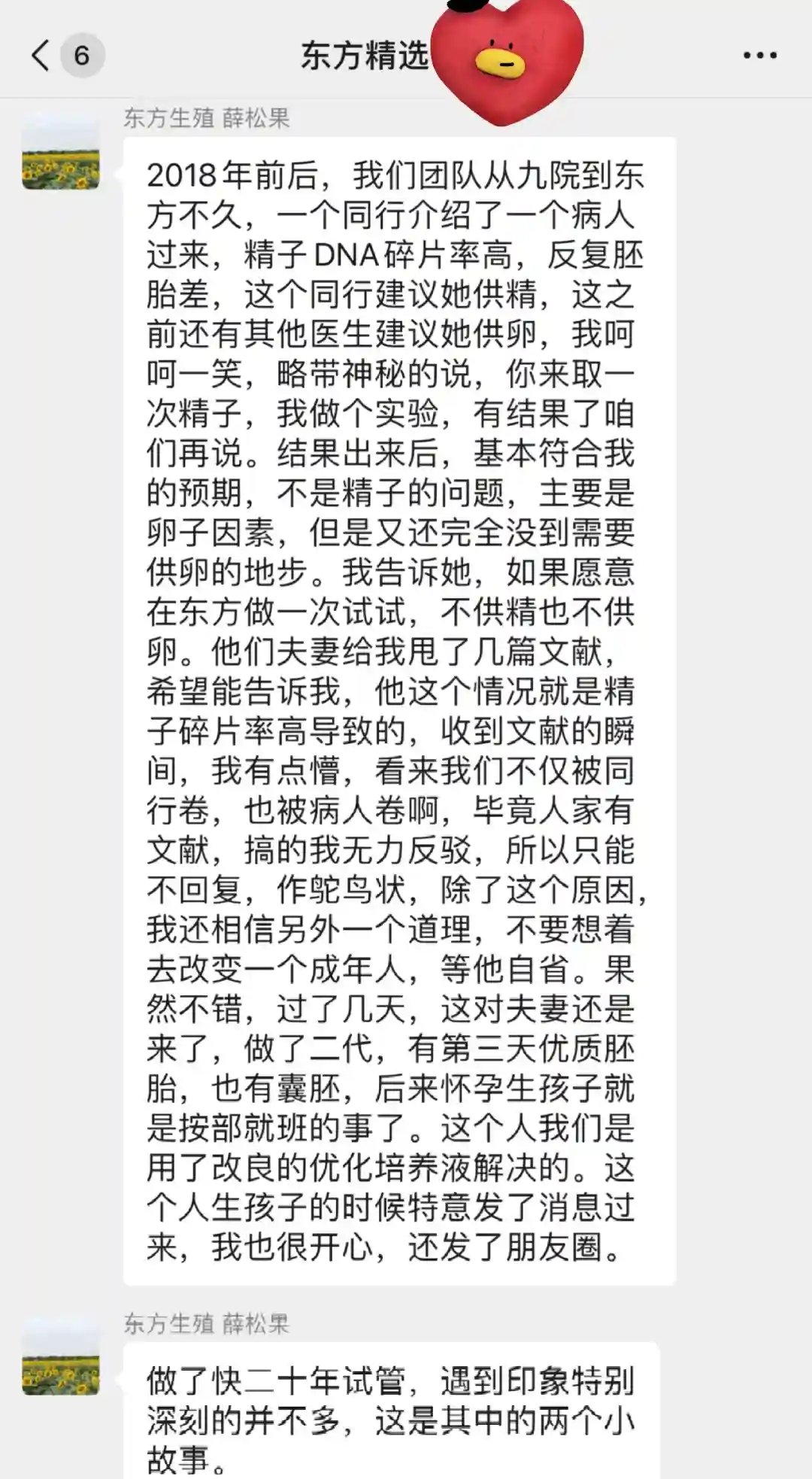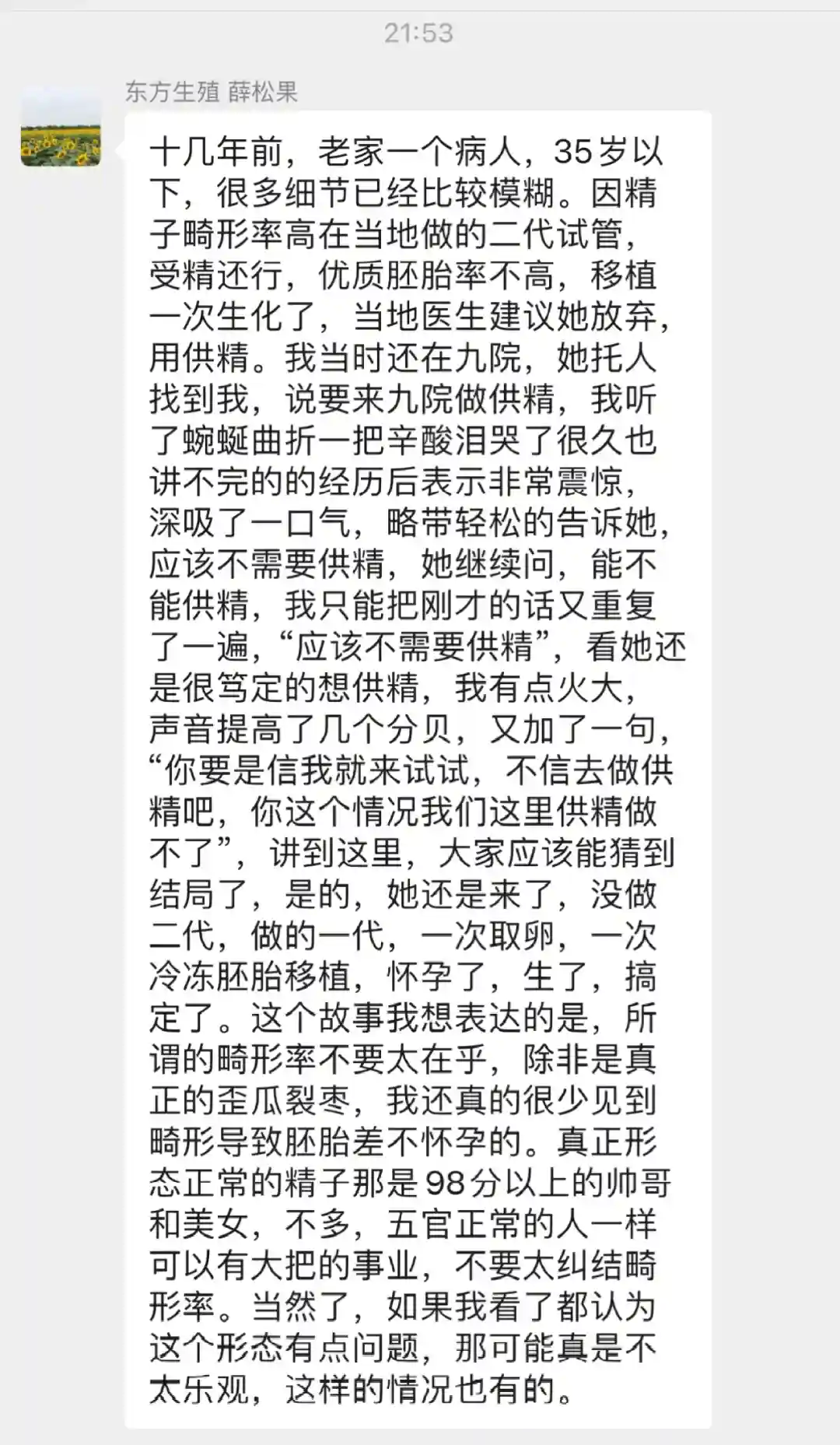 摘录故事二:2018年前后,我们团队从九院到东方不久,一个同行介绍了一个病人过来,精子DNA碎片率高,反复胚胎差,这个同行建议她供精,这之前还有其他医生建议她供卵,我呵呵一笑,略带神秘的说,你来取一次精子,我做个实验,有结果了咱们再说。结果出来后,基本符合我的预期,不是精子的问题,主要是卵子因素,但是又还完全没到需要供卵的地步。我告诉她,如果愿意在东方做一次试试,不供精也不供卵。他们夫妻给我甩了几篇文献,希望能告诉我,他这个情况就是精子碎片率高导致的,收到文献的瞬间,我有点懵,看来我们不仅被同行卷,也被病人卷啊,毕竟人家有文献,搞的我无力反驳,所以只能不回复,作鸵鸟状,除了这个原因,我还相信另外一个道理,不要想着去改变一个成年人,等他自省。果然不错,过了几天,这对夫妻还是来了,做了二代,有第三天优质胚胎,也有囊胚,后来怀孕生孩子就是按部就班的事了。这个人我们是用了改良的优化培养液解决的。这个人生孩子的时候特意发了消息过来,我也很开心,还发了朋友圈。