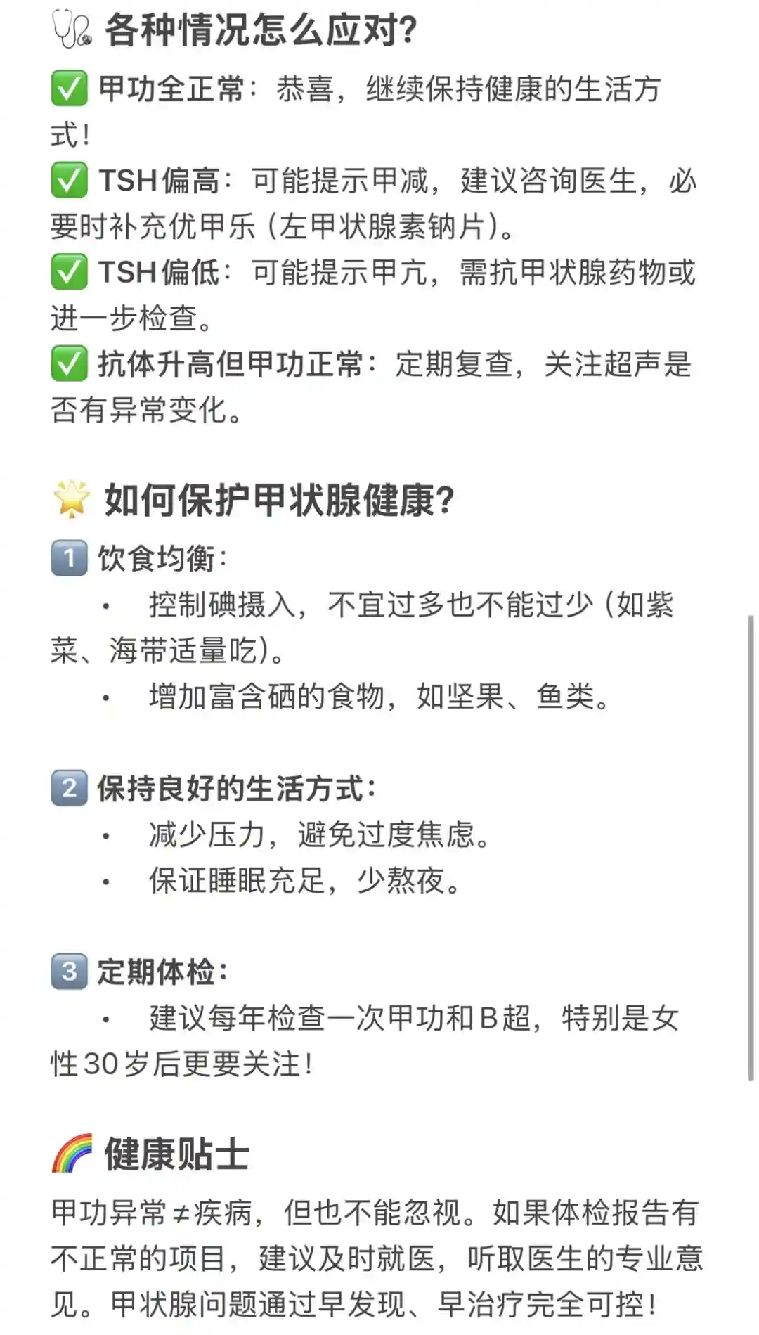 🌈 健康贴士甲功异常≠疾病,但也不能忽视。如果体检报告有不正常的项目,建议及时就医,听取医生的专业意见。甲状腺问题通过早发现、早治疗完全可控!